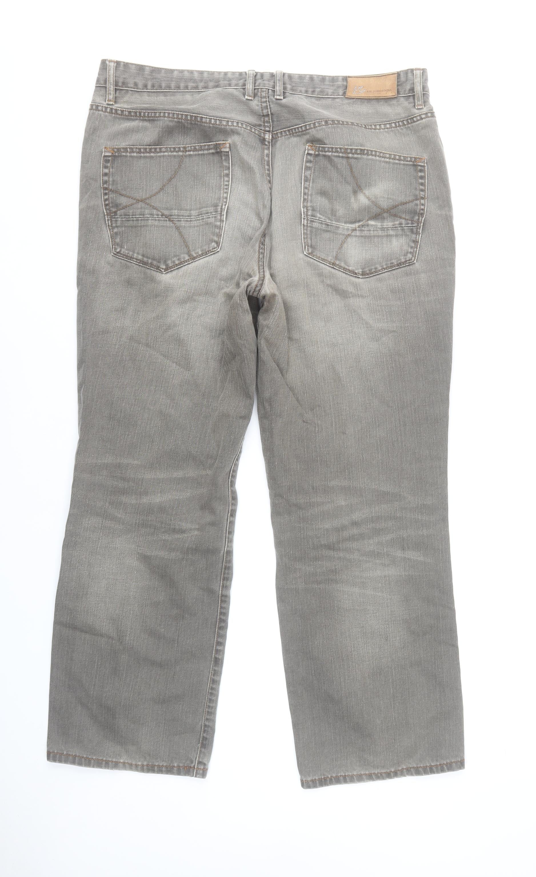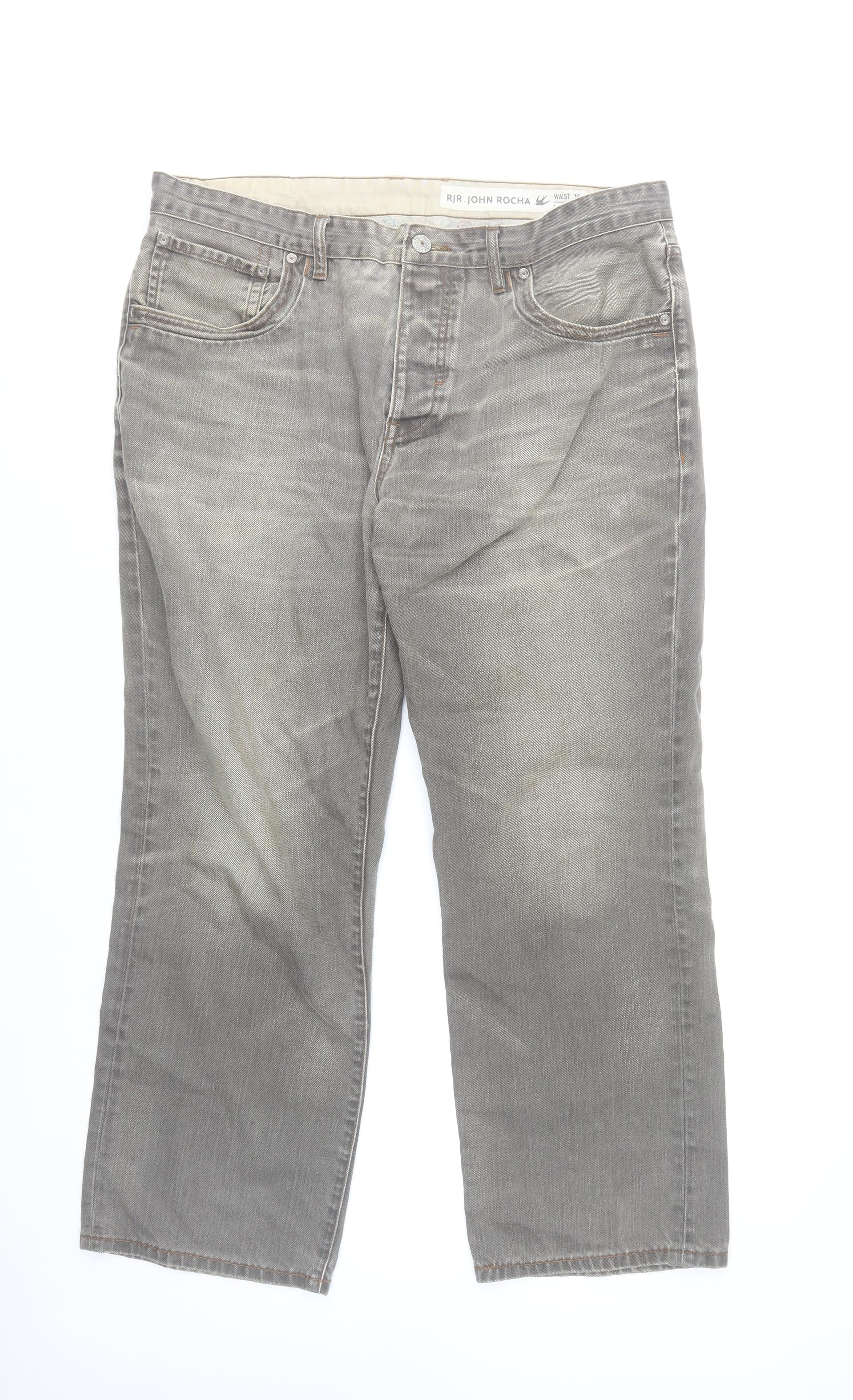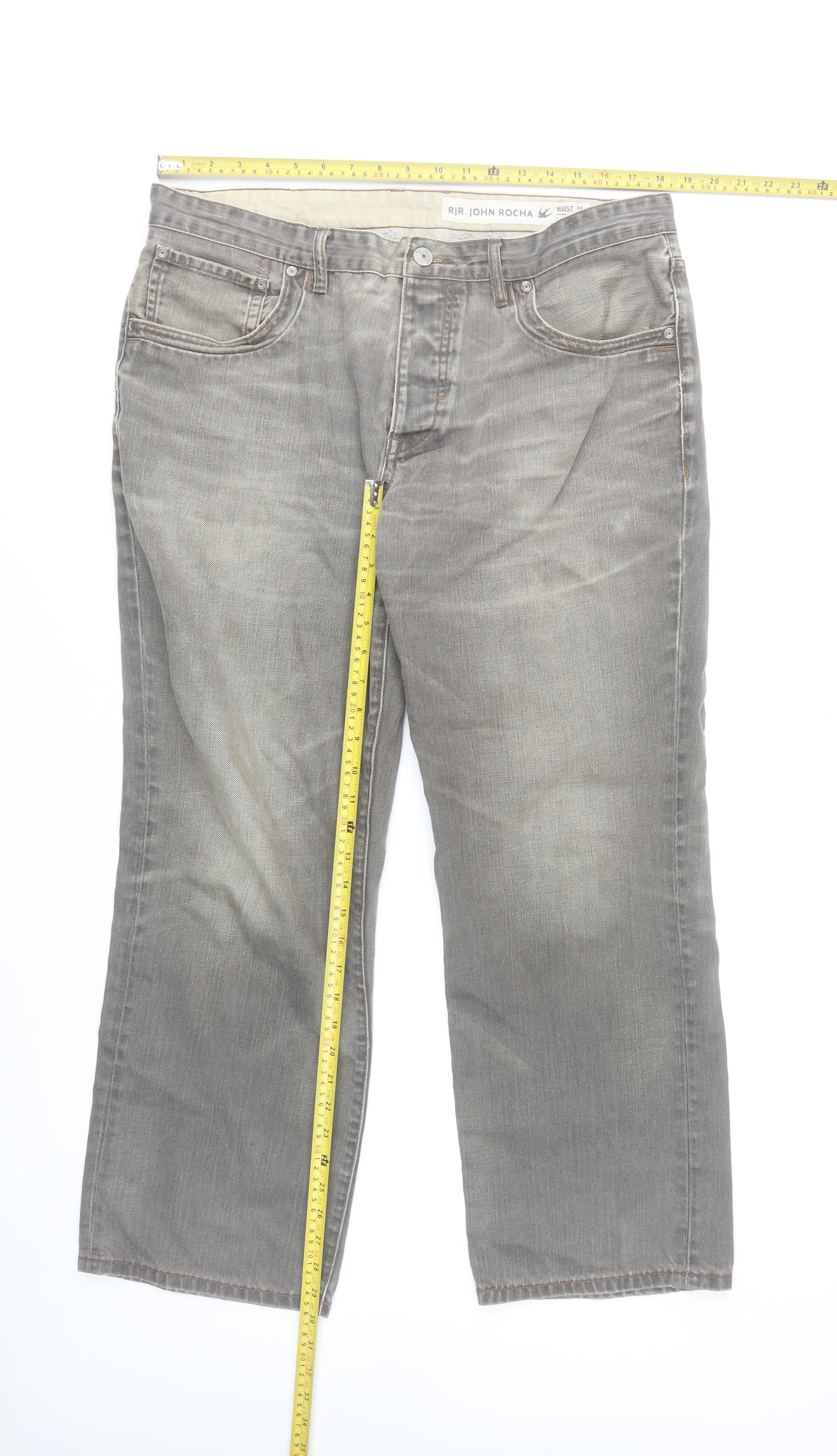 These RJR John Rocha men's jeans offer timeless style with a modern touch, crafted from high-quality 100% cotton denim with 100% leather trim detailing. Presented in a versatile grey tone with a subtle medium wash, these jeans are designed for comfort and everyday practicality. They feature a regular fit throughout with a straight leg cut, making them a perfect choice for relaxed or smart-casual wear. The soft, breathable cotton fabric combines durability with a naturally comfortable feel, ideal for year-round use.A classic five-pocket design, button and zip fastening, and carefully placed stitching add character to the garment. The mid-rise waist ensures a balanced fit that sits comfortably, while the grey hue pairs effortlessly with shirts, T-shirts, and jumpers of all colours and styles. Designed with RJR John Rocha's signature attention to detail, the jeans also include minimal fading across the legs, offering an effortlessly worn-in look without compromising on quality.Measuring a 38-inch waist and a 30-inch inside leg, these jeans are tailored for a confident, contemporary fit that complements a wide range of builds. Their durable denim maintains its structure wash after wash, while the leather trim adds a subtle premium finish. Perfect for casual days out, evening gatherings, or even laidback office styling, these jeans combine style, comfort, and craftsmanship superbly. In very good pre-owned condition with minor natural fading, they promise continuing wear and versatility for your wardrobe. A wardrobe essential for any man seeking understated and dependable fashion at an accessible price.