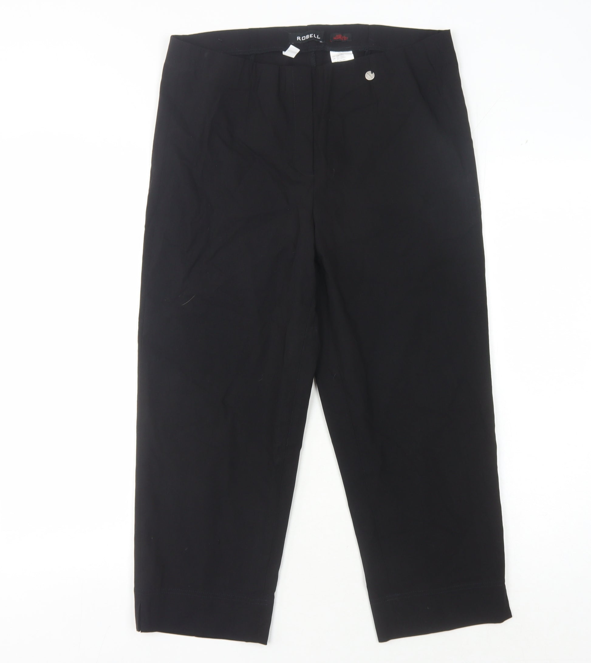 Introducing the Robell Women's Black Trousers, a versatile and sophisticated wardrobe essential designed to deliver both style and comfort. Crafted to perfection, these trousers offer a sleek black hue that makes them an effortless choice for any occasion, whether a formal meeting or a casual outing. The trousers are fashioned in size 14, fitting comfortably and providing an elegant silhouette that flatters every body type. Designed with a blend of 72% Viscose, 24% Polyamide, and 4% Elastane, these trousers ensure a comfortable fit while retaining their shape. Despite their excellent condition, no visible original tags are attached, marking them ready for immediate wear. These trousers, made by the reputable brand Robell, exhibit a classic design with no specific pattern, allowing them to pair seamlessly with a range of tops and accessories. Ideal for women looking for regular size formal attire, they can elevate a simple blouse or enhance a statement top. Sleek and reliable, these trousers are easy to maintain and extremely practical for day-to-day usage or special occasions. Invest in these exquisite Robell trousers to enrich your clothing collection, providing both style and a touch of elegance.
