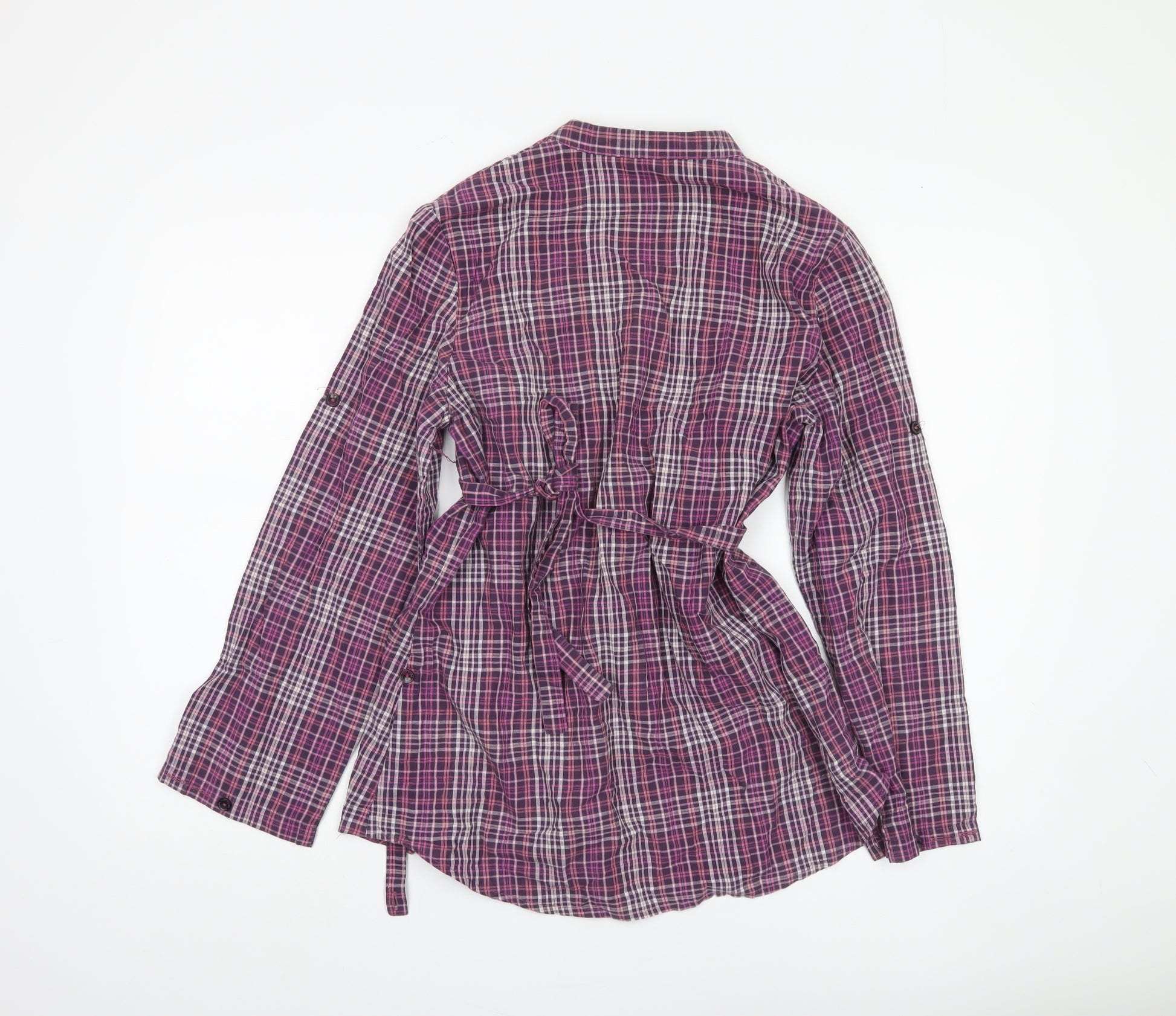 Elevate your casual wardrobe with this stylish Rocha John Rocha women's blouse in a vibrant purple plaid pattern. Perfect for everyday wear, this blouse offers a comfortable regular fit ideal for all-day comfort. Made from 100% cotton, it ensures breathability and a soft feel against your skin, making it perfect for easy, machine-washable care. Featuring a classic V-neckline and long sleeves, this blouse adds a touch of elegance to your everyday look. The button closure adds a practical touch while the adjustable strap provides a customizable fit. Whether you're heading out for a casual day with friends or relaxing at home, this blouse fits the occasion effortlessly. Its unique plaid pattern adds a splash of style to your ensemble, guaranteeing that you'll stand out in any crowd. This blouse is in very good condition, ready to be a staple in your wardrobe. Take this chance to add a versatile piece to your collection that combines style with practicality. Explore the possibilities with this Rocha John Rocha blouse that can be easily paired with your favorite jeans or skirts for a complete look.