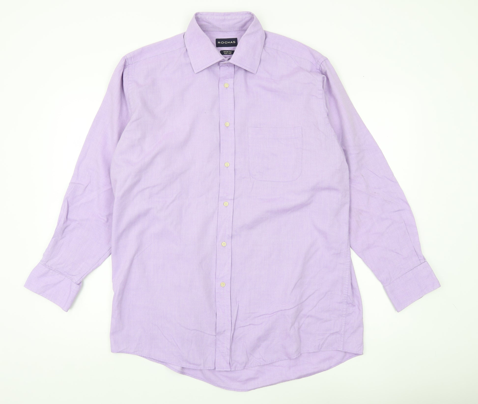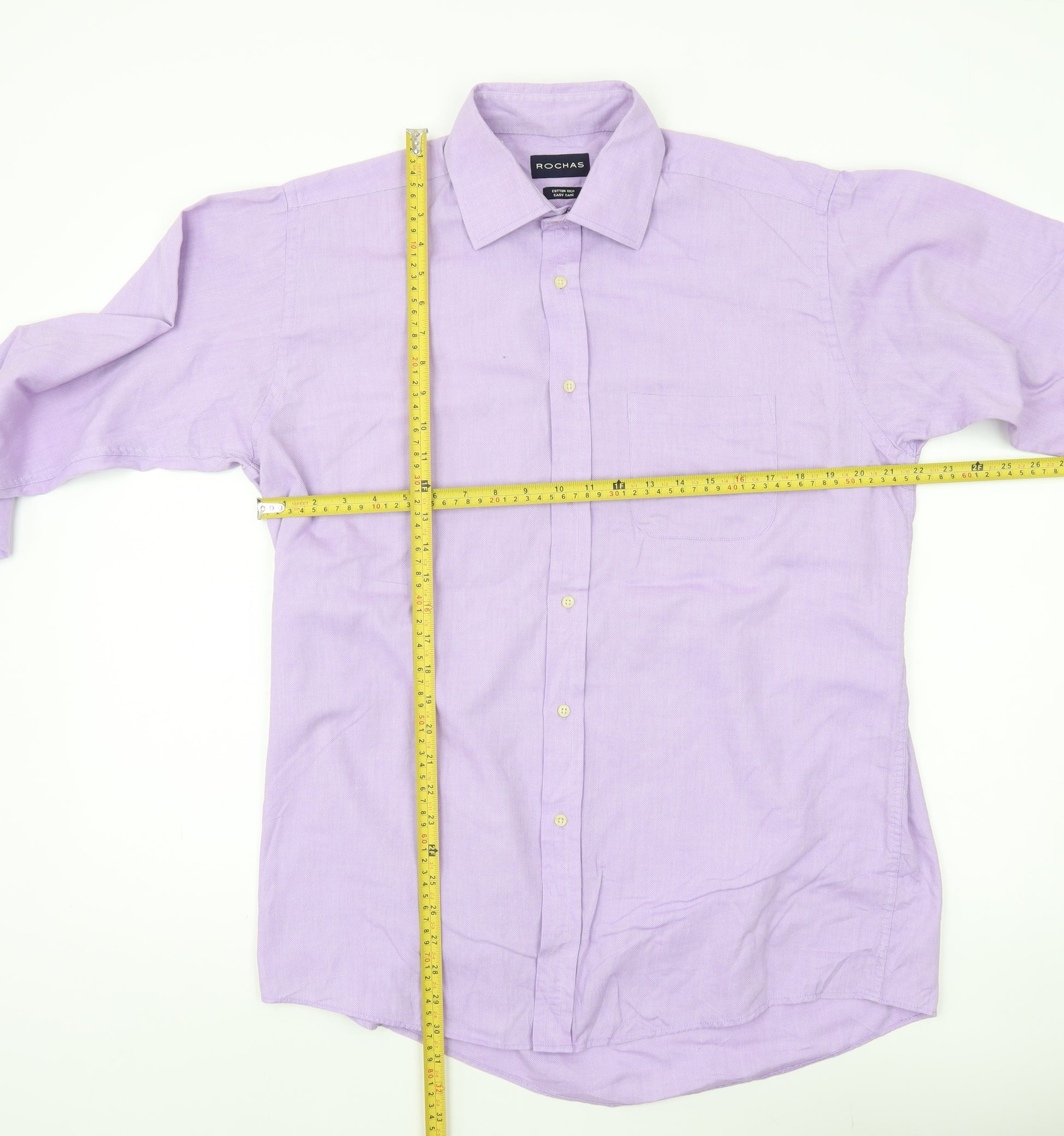 This Rochas men’s purple dress shirt offers a refined combination of style and comfort, making it a versatile addition to any smart wardrobe. Tailored in a classic regular fit, this shirt features a collared neckline and point collar style, giving it a timeless, sharp finish ideal for business, weddings, and formal occasions. Cut from a practical cotton-rich easy-care fabric (approximately 60% cotton, 40% polyester), it provides breathable comfort and easy maintenance, ensuring you look polished throughout the day without the hassle. The shirt is designed with a chest size of around 110 cm and a length of 80 cm, with a neck size of 42 cm (16.5 inches), making it a solid choice for those seeking a tailored yet comfortable silhouette. A button-up closure runs neatly down the front and is complemented by sturdy barrel cuffs, perfectly suited for both dress and tie ensembles. The long sleeves further enhance its formality, while the woven cotton blend fabric ensures softness, durability, and year-round wearability. A solid purple tone adds a touch of understated distinction, standing out from traditional white and blue shirts while remaining versatile enough to be paired with a wide variety of suits, blazers, and ties. This makes it an ideal choice for those wishing to bring a subtle pop of colour to their workwear or formal attire without losing professionalism. Whether worn for an important office meeting, a formal event, or special celebrations like weddings, this shirt delivers both style and practicality. Although pre-owned, the shirt remains in very good condition with only light creasing visible, showing no major defects or damage. Priced affordably, it represents an excellent opportunity to add a high-quality, stylish formal staple to your collection without breaking the bank. Pair it with tailored trousers for business wear, or match it with a suit to elevate your formal occasion look. A smart, versatile piece, it blends classic design with modern practicality.