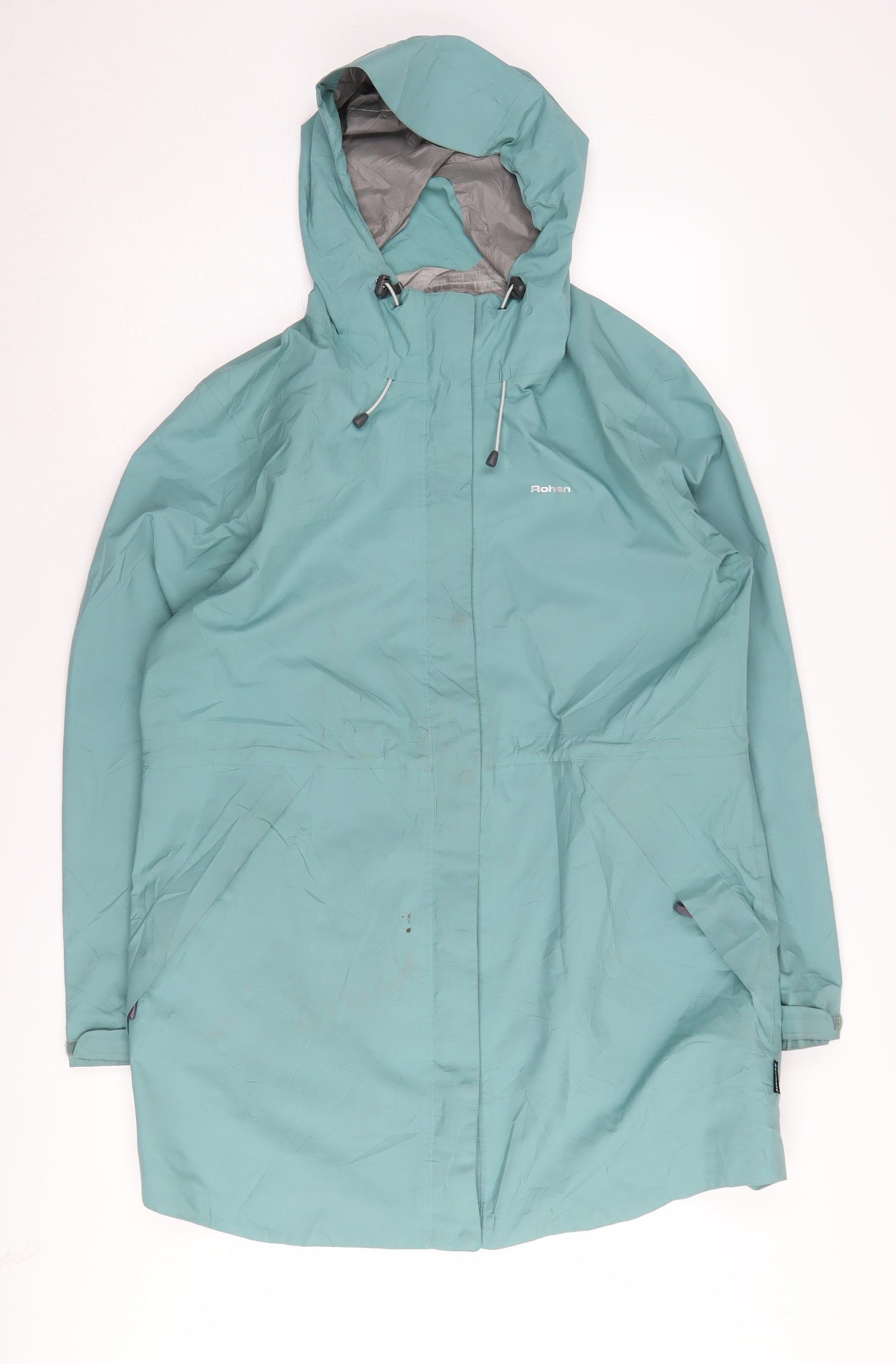 Explore the great outdoors with confidence in this Rohan rain coat, crafted from durable polyester with a polyurethane hydrophilic membrane to ensure top-tier waterproofing. Designed in a refreshing green hue, this long-length jacket offers excellent protection against the elements, making it a versatile choice for autumn and winter adventures. Ideal for casual outings or travel, its hooded design ensures you stay dry, while the zip closure provides convenient wearability. Despite some minor marks, this robust jacket promises practical style for women who love an active lifestyle.
