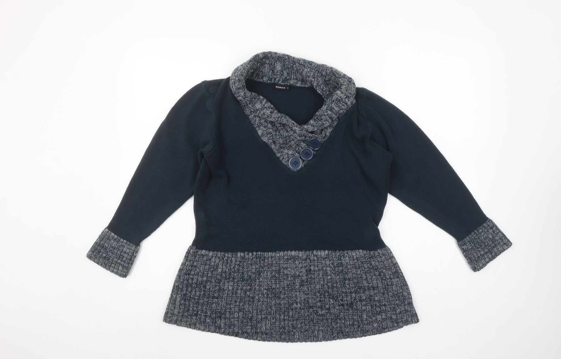 Elevate your casual wardrobe with this stylish blue pullover jumper from Roman. Crafted with a blend of soft acrylic and durable polyester, this comfortable knit is designed to keep you warm during the cooler months. The jumper features contrasting grey ribbed trims on the cuffs and hem, adding a refined touch of texture and sophistication to its classic style. The deep V-neckline with chunky button detailing provides a unique focal point, setting this piece apart while maintaining an elegant and versatile look.The regular fit ensures a flattering silhouette that works well for layering over shirts or wearing on its own. Designed for all seasons, but particularly ideal for autumn and winter, this jumper provides cosy warmth without sacrificing style. The stretchy knit fabric allows for flexibility and comfort, making it perfect for day-to-day wear, whether you’re running errands, meeting friends, or enjoying a quiet evening out.In a harmonious combination of navy blue and grey, this Roman jumper is easy to pair with denim jeans or tailored trousers for an effortlessly chic outfit. Its long sleeves and ribbed knit finish give it a polished yet relaxed appeal. The all-season versatility, soft tactile knit, and timeless design ensure it will quickly become a favourite part of your collection.Presented in excellent pre-owned condition, this jumper shows minimal signs of wear and has been well cared for. If you’re looking for an affordable, high-quality knitwear piece that offers both comfort and sophistication, this Roman jumper delivers. Suitable for unisex adults seeking a polished yet cosy look, it brings subtle detail through its button accents and elegantly shaped neckline. Perfect for smart-casual settings, cool-weather outings, or simply staying snug in style, this piece represents true value and lasting wearability.