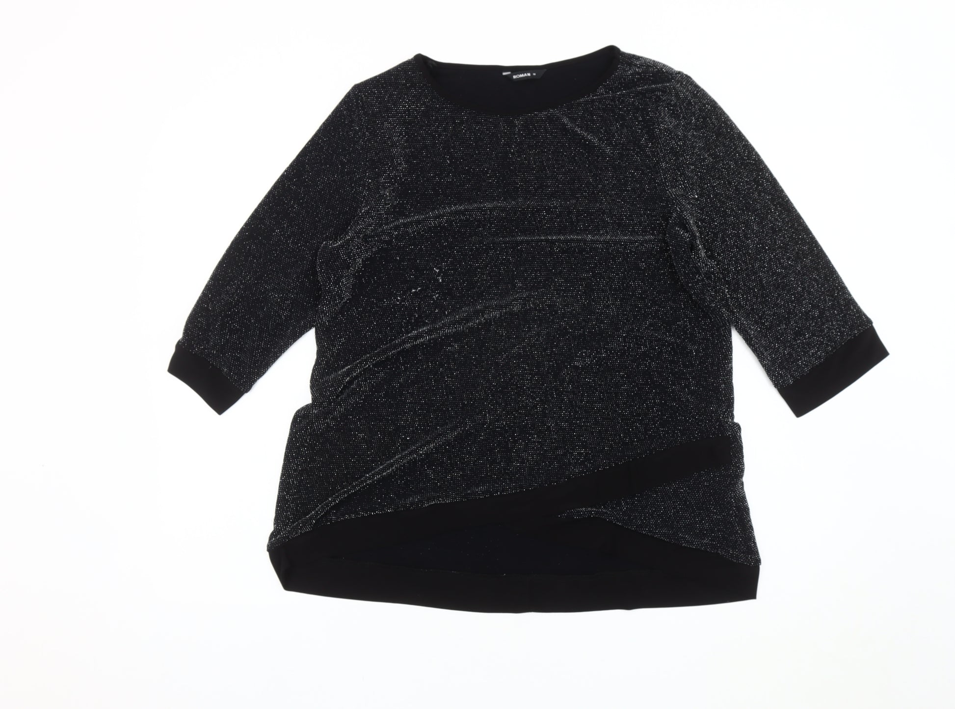 Enhance your wardrobe with this stylish black sparkle top from Roman, tailored specifically for women. This elegant piece features a subtle shimmer from its metallic-infused fabric, making it perfect for both casual outings and evening events alike. Designed with a comfortable 3/4 sleeve and a classic round neckline, the top offers an effortless blend of comfort and style. Constructed from a soft blend of polyamide, metallic, and elastane, it promises flexibility and a flattering fit. Ideal for layering or standalone wear, this top is as versatile as it is fashionable. Hand wash only to maintain its pristine condition. Available in size 14, it is poised to add a touch of elegance to any ensemble without compromising on comfort.