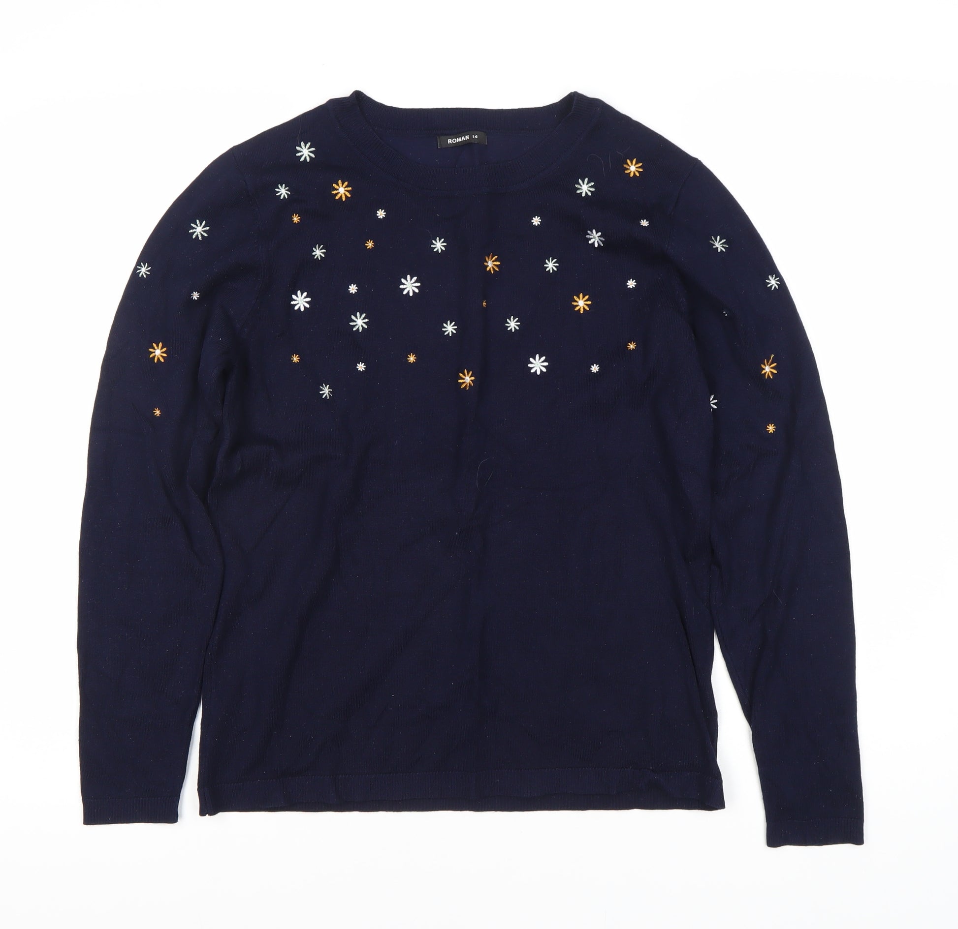 Step into comfort and style with this Roman Women's Pullover Jumper, presented in a timeless blue that complements any wardrobe. Crafted in size 14, this jumper promises a comfortable and flattering fit for a regular silhouette. Made with a thoughtful blend of 70% Viscose and 30% Polyester, it is both soft and durable, ensuring you stay cosy and warm in every season. Designed with a classic crew neck and long sleeves, it brings a versatile touch to your casual collection. The exquisite embroidered accents add a unique charm, turning a simple design into a statement piece that catches the eye. Whether you're lounging at home or taking a stroll in the park, this jumper suits every casual occasion seamlessly. Although previously owned, it remains in excellent condition with no visible signs of wear, offering a polished look without the brand new price tag. Pair it with your favourite jeans or skirt for an effortlessly chic outfit. Hand wash only to maintain its elegant look. Don’t miss out on adding this charming, quality piece to your ensemble.