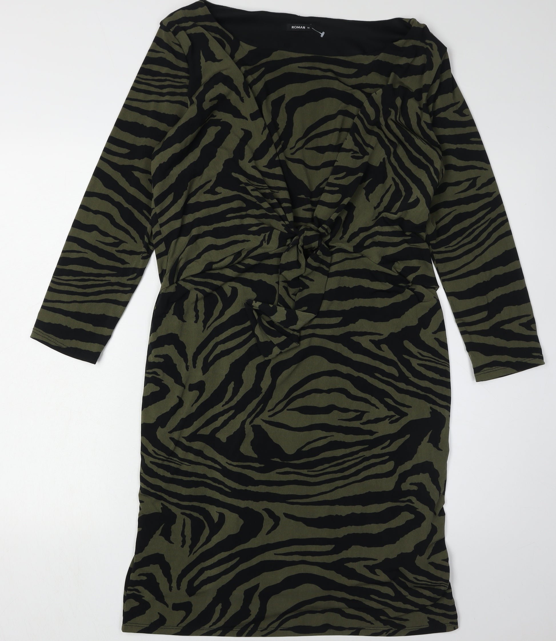 Step into style with this Roman Women's Pencil Dress, crafted with an eye-catching animal print pattern in a vibrant green hue. Perfectly suited for the fashion-forward woman, this dress promises to be a standout piece in any wardrobe. Constructed from a comfortable and stretchy jersey fabric, this dress ensures a flattering fit while allowing for easy movement, making it ideal for both casual outings and sophisticated workwear events. Designed with a V-neckline and long sleeves, it provides a sleek silhouette that complements its pencil dress style. The dress is enhanced with a subtle knot accent at the front, adding an extra touch of elegance. Made from a blend of 96% polyester and 4% elastane, it offers both durability and flexibility, and can be easily cared for with machine washing. Whether you're planning for an Autumn or Spring occasion, this timeless piece is a versatile addition to your repertoire. With its regular size type fit, this dress highlights your figure while offering enough room for comfort, ensuring you look effortlessly put together. Don't miss this opportunity to own a piece that combines practicality with style. Perfect for animal print enthusiasts and those who appreciate the finer details. Experience a new level of elegance and confidence with this Roman Women's Pencil Dress.