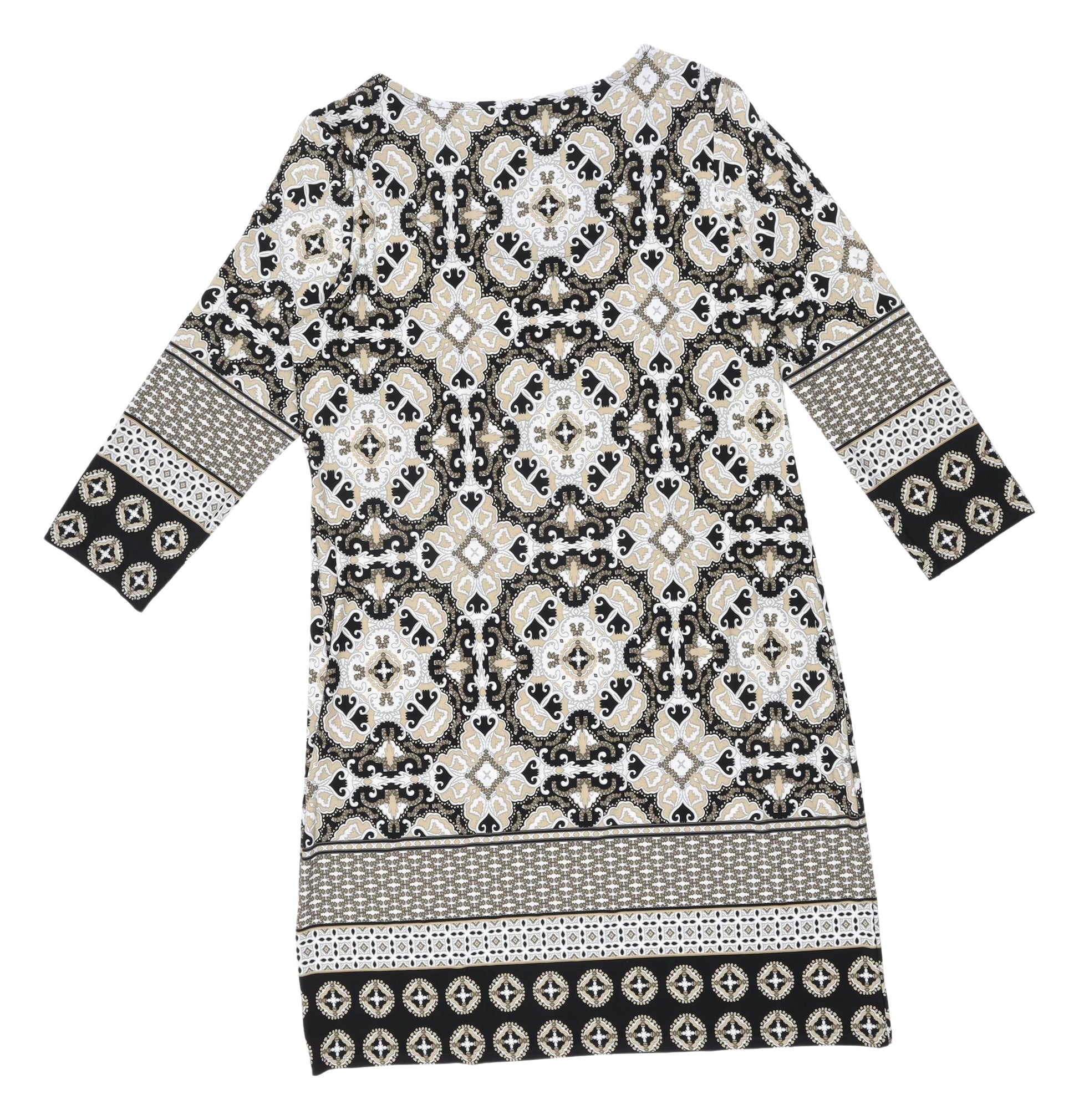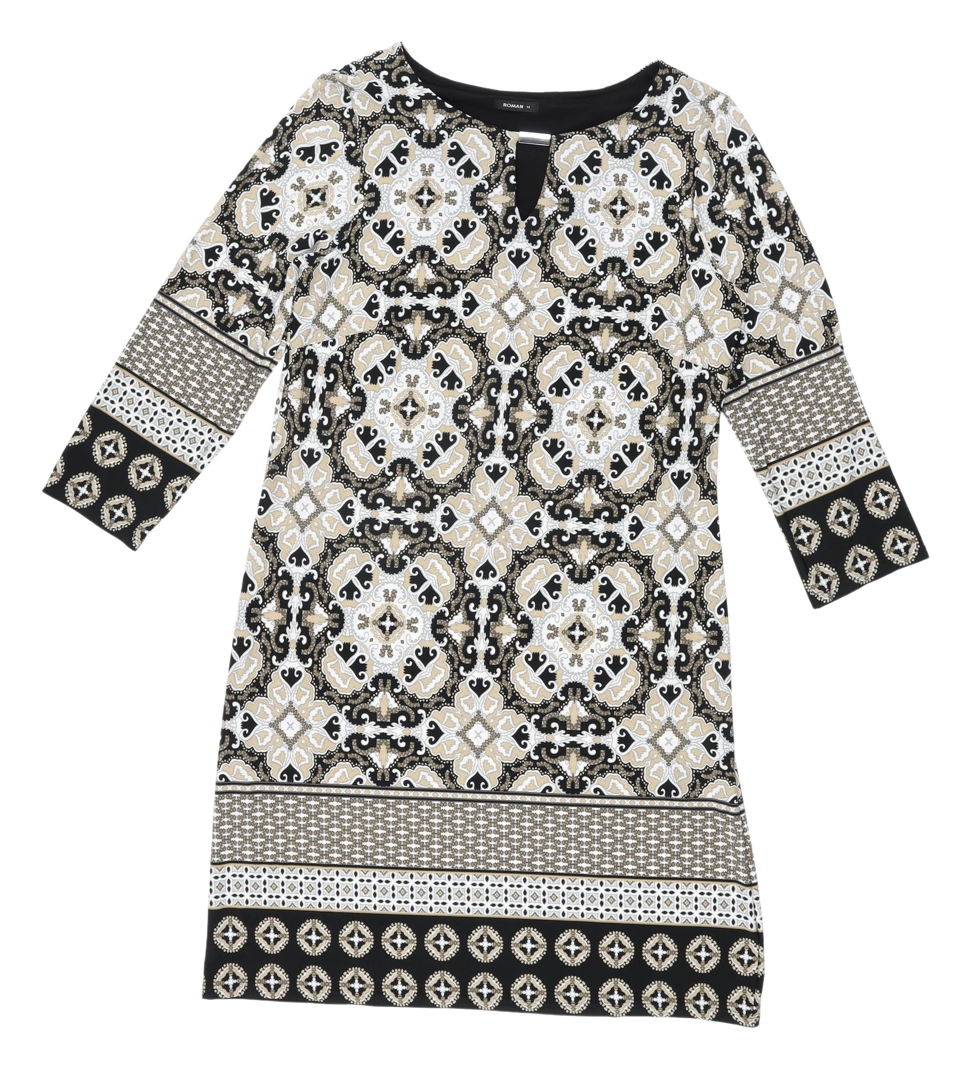 Embrace style and comfort with this striking Roman dress, crafted for the modern woman. The multicoloured geometric pattern adds a chic touch, making this piece a versatile addition to your wardrobe. Made from a soft blend of polyester and elastane, it offers a comfortable fit that moves with you. The dress features a round neckline with a delicate keyhole detail, providing a subtle yet elegant accent to your look. With 3/4 sleeves, it's perfect for transitioning through seasons with ease. Whether you're attending a casual gathering or a semi-formal event, this dress ensures you stay stylish and comfortable all day. Easy to care for, it's machine washable, ensuring it remains a favourite in your collection. Discover the perfect blend of fashion and function with this Roman geometric dress.