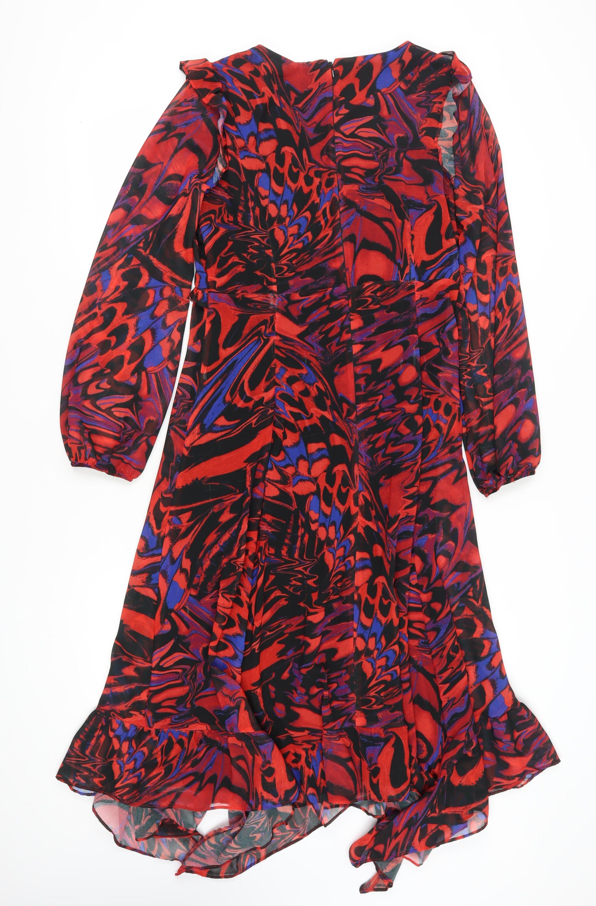 This striking Roman women's wrap dress in an abstract red print is perfect for those looking to make a statement. With its vibrant colours and elegant midi length, this dress is ideal for autumn and winter parties, effortlessly combining style and comfort. Crafted from lightweight chiffon, lined for added opacity, this dress features luxurious long puff sleeves that add a touch of sophistication. Its asymmetric ruffle accents offer a modern twist, enhancing the chic V-neckline and flattering wrap style. The dress is easy to wear with a discreet zip closure, and the abstract pattern lends an eye-catching aesthetic that captures attention. Whether you’re attending a cocktail party or a formal gathering, this dress promises to turn heads and leave a lasting impression. Designed for a regular fit in size 14, this garment ensures comfort without compromising on style. Easy to care for with its machine washable fabric, you can maintain its pristine look with minimal effort. Embrace the retro theme and step out in confidence with a dress that speaks volumes about your sense of style.