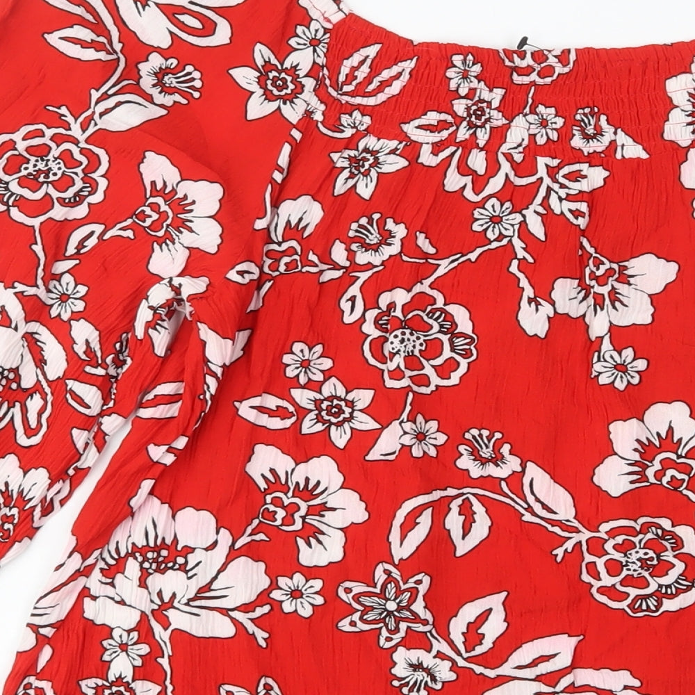 Womens Red Floral Viscose Basic T-Shirt Size 14 Scoop Neck