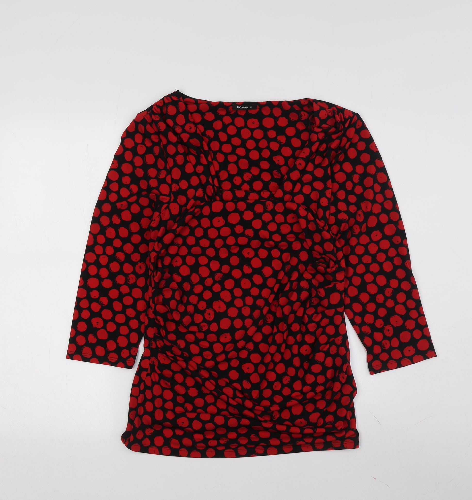 Enhance your wardrobe with this stylish Roman Women's Red Polka Dot Tunic, perfect for casual occasions or a day out. Crafted with a comfortable blend of polyester and elastane, this tunic promises a flattering fit and enduring freshness to your wardrobe. The bold red colour with playful polka dot pattern gives it an eye-catching appeal, while the relaxed tunic style ensures comfort throughout wear. Featuring a sophisticated boat neckline and versatile 3/4 sleeves, this piece adapts seamlessly from day to night, perfect for any season. Ideal for pairing with jeans or leggings, this top offers various styling options. The fabric is machine washable for easy maintenance, ensuring it's always ready for your next outing. Add this exquisite piece to your collection and enjoy a chic, laid-back look with a touch of elegance.