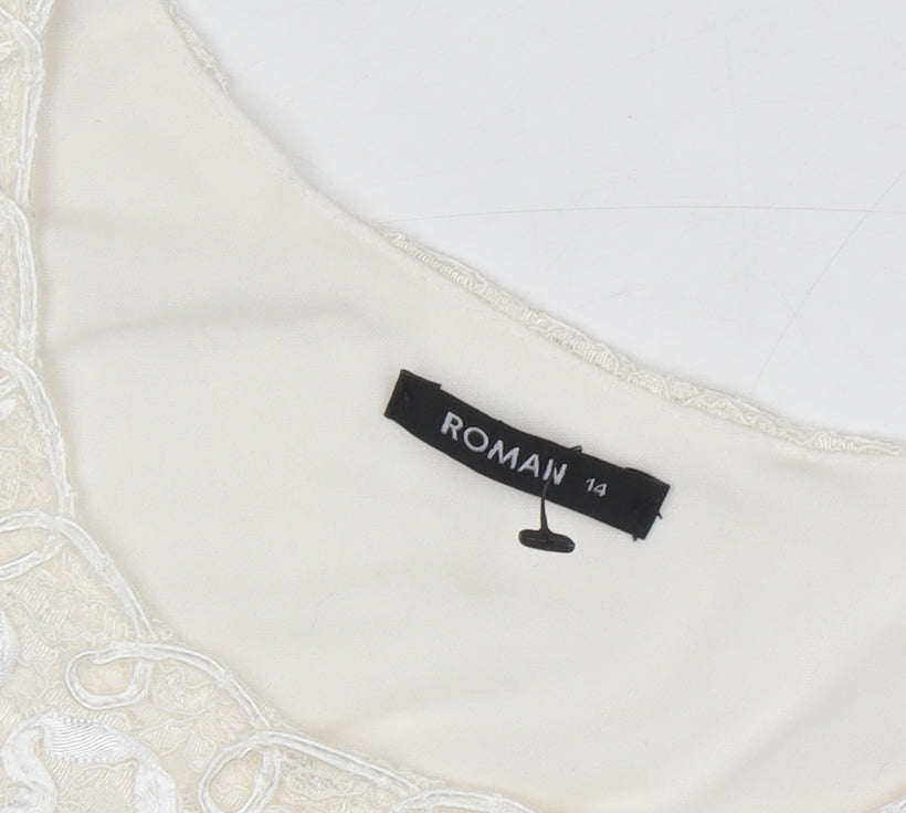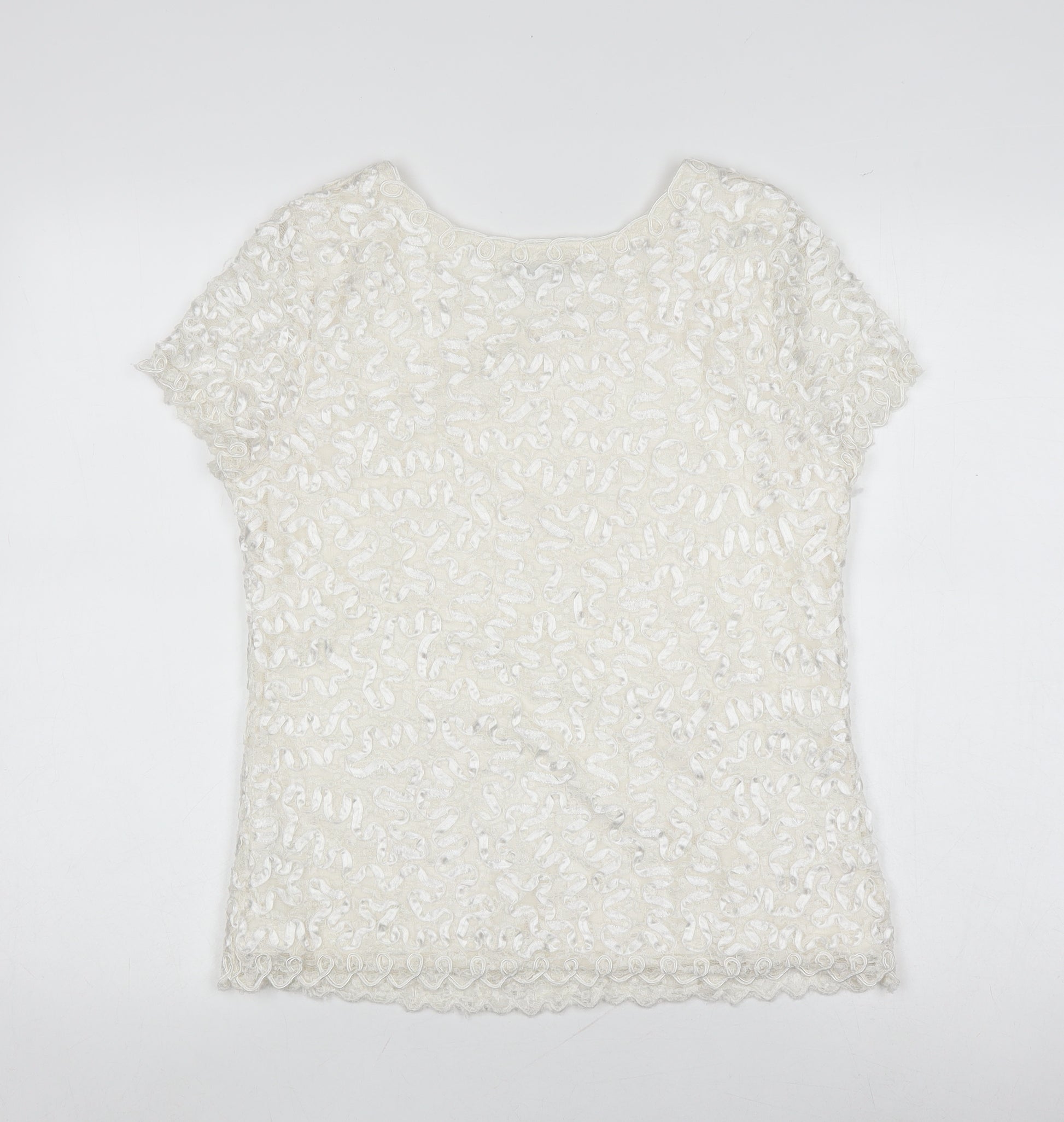 Elevate your wardrobe with this exquisite Roman Women's Crochet Sequin T-Shirt. Designed in a versatile white hue, this t-shirt features a flattering scoop neckline and short sleeves, making it perfect for spring and summer occasions. Crafted from a comfortable cotton blend, its crochet fabric adds a touch of elegance and texture, while the sequinned embroidery accentuates a sophisticated style. Ideal for party or cocktail settings, the solid pattern and regular fit ensure a timeless and chic look. Whether paired with jeans for a casual outing or a skirt for a more dressed-up appearance, this t-shirt is a versatile addition to any collection. Despite showing no visible flaws and in excellent condition, this top is a stylish option for those seeking to add a bit of sparkle to their look.