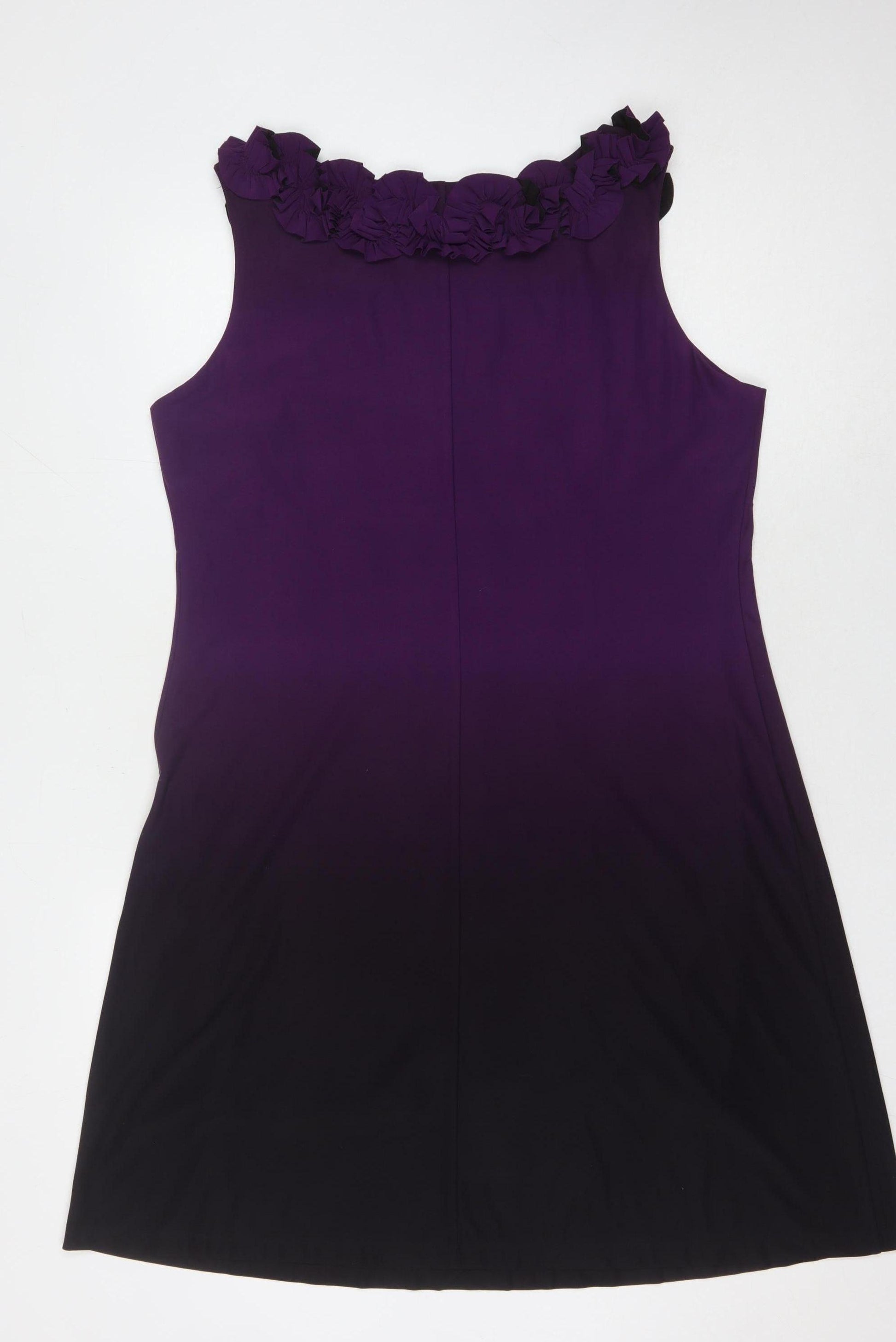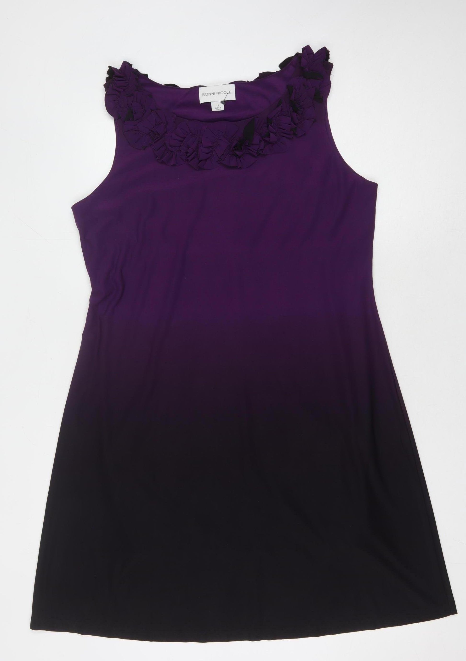 Experience timeless elegance with this Ronni Nicole women's dress, perfect for your next party or cocktail event. Crafted from a comfortable jersey fabric blend of polyester and elastane, this dress offers a soft touch and a slight stretch for a flattering fit. The beautiful purple hue makes a striking statement, while the sleeveless design and round neckline enhance its sophisticated appeal. A charming ruffle accent at the neckline adds a touch of femininity, making this dress a versatile piece ideal for spring and summer occasions. Designed for women size 18, this pullover dress ensures ease and style on any evening out. Add this elegant Ronni Nicole dress to your wardrobe for a chic and confident ensemble.