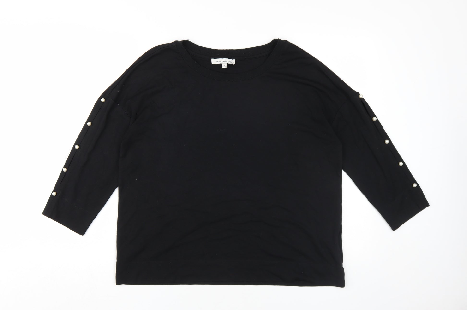 This Rose+Olive black 3/4 sleeve T-shirt is the perfect addition to any wardrobe, offering a versatile combination of comfort and style. Crafted from a blend of 72% rayon, 23% polyester, and 5% elastane, this top ensures a soft, stretchy fit that drapes gracefully over the body. The simple yet chic round neckline adds a touch of elegance, making it a suitable choice for both casual outings and more relaxed office environments. Featuring a solid black colour with button accents along the sleeves, this top adds a subtle decorative element while maintaining a sleek, contemporary appearance. The regular fit ensures it is flattering for various body shapes, while the comfortable, machine-washable fabric makes it easy to care for. In very good condition, this top shows slight signs of wear but remains in excellent shape, with all buttons intact. Perfect for layering or wearing on its own, it's a timeless piece that you'll reach for repeatedly. Pair it with jeans for a laid-back weekend look or wear it with slacks for a more polished ensemble.