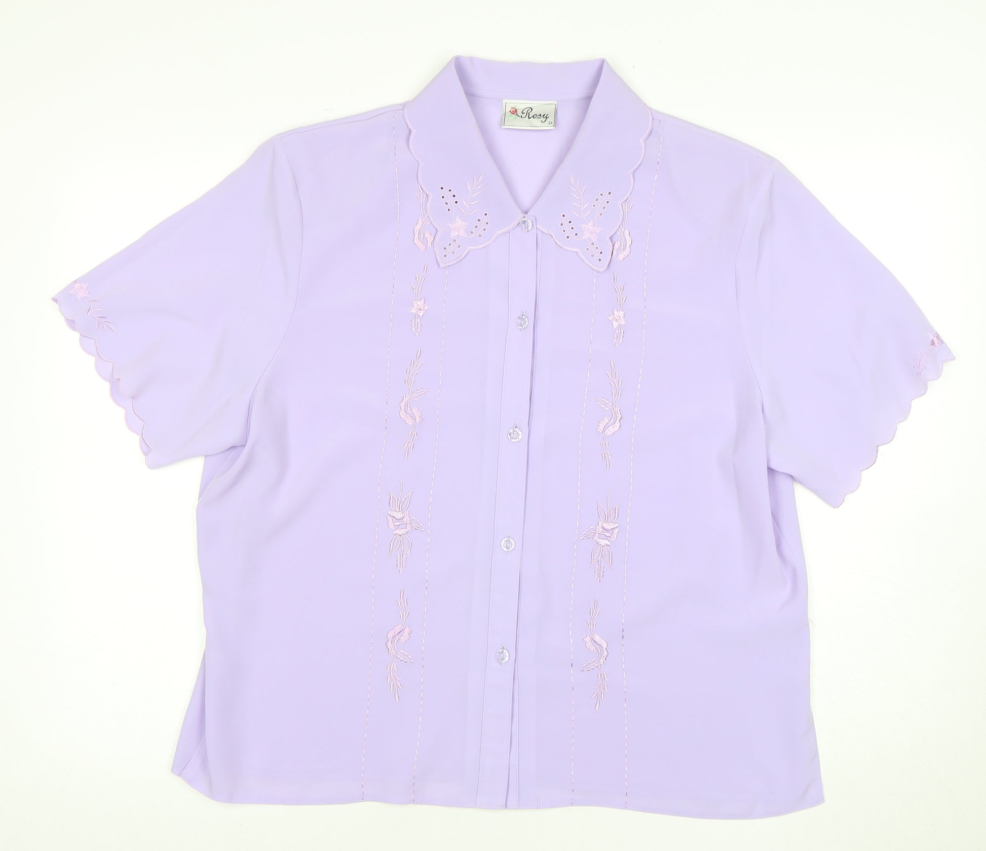 This elegant Rosy blouse features a charming lavender hue, enhanced by delicate embroidered details that add a touch of sophistication. Perfect for both casual and business settings, its collared neckline and button closure offer a classic appeal. Crafted with care, this short sleeve blouse is a versatile addition to any wardrobe, ideal for pairing with trousers or skirts for a sleek, polished look.