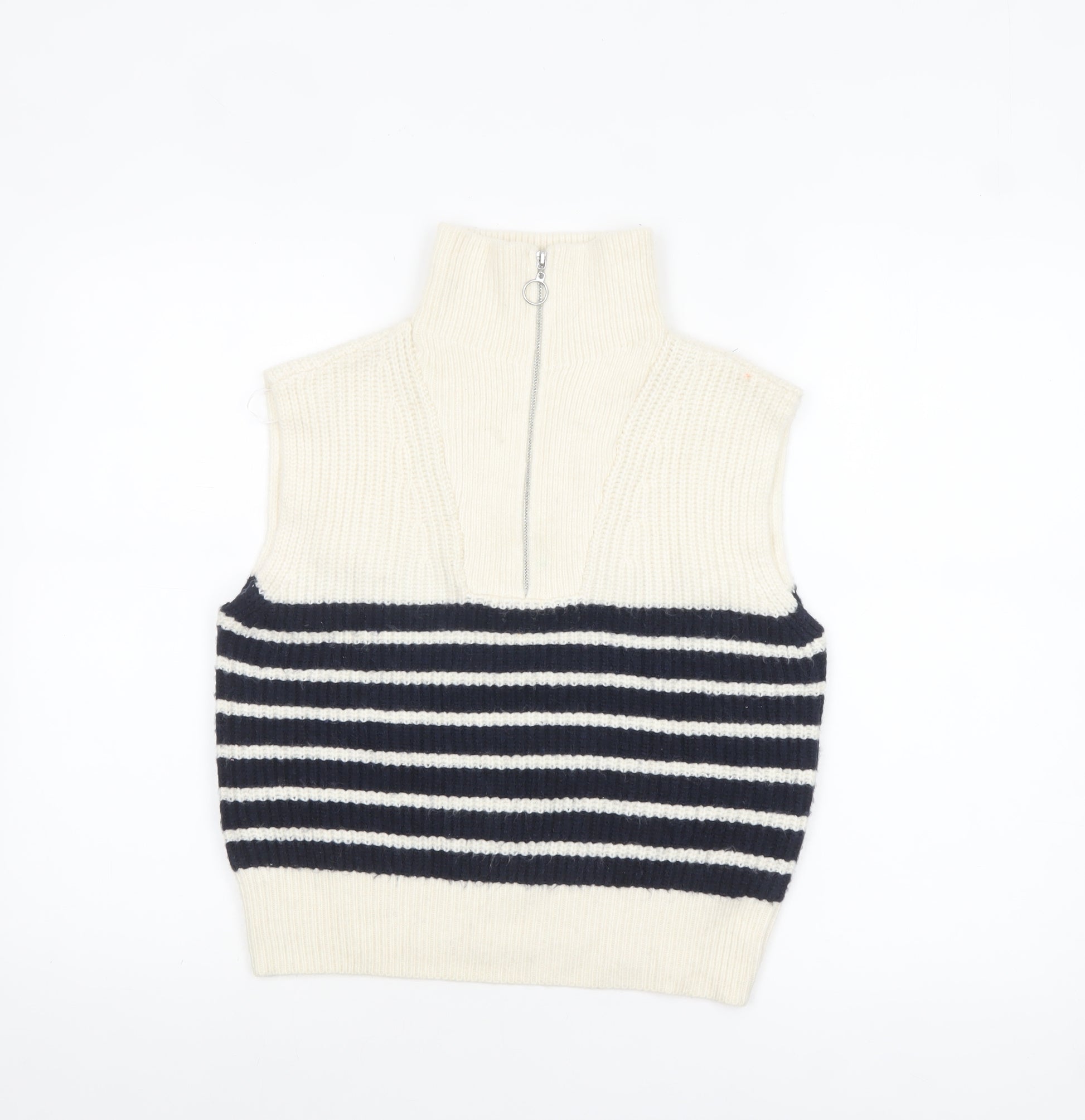 Women Ivory Striped Half Zip Sleeveless Knit Vest S