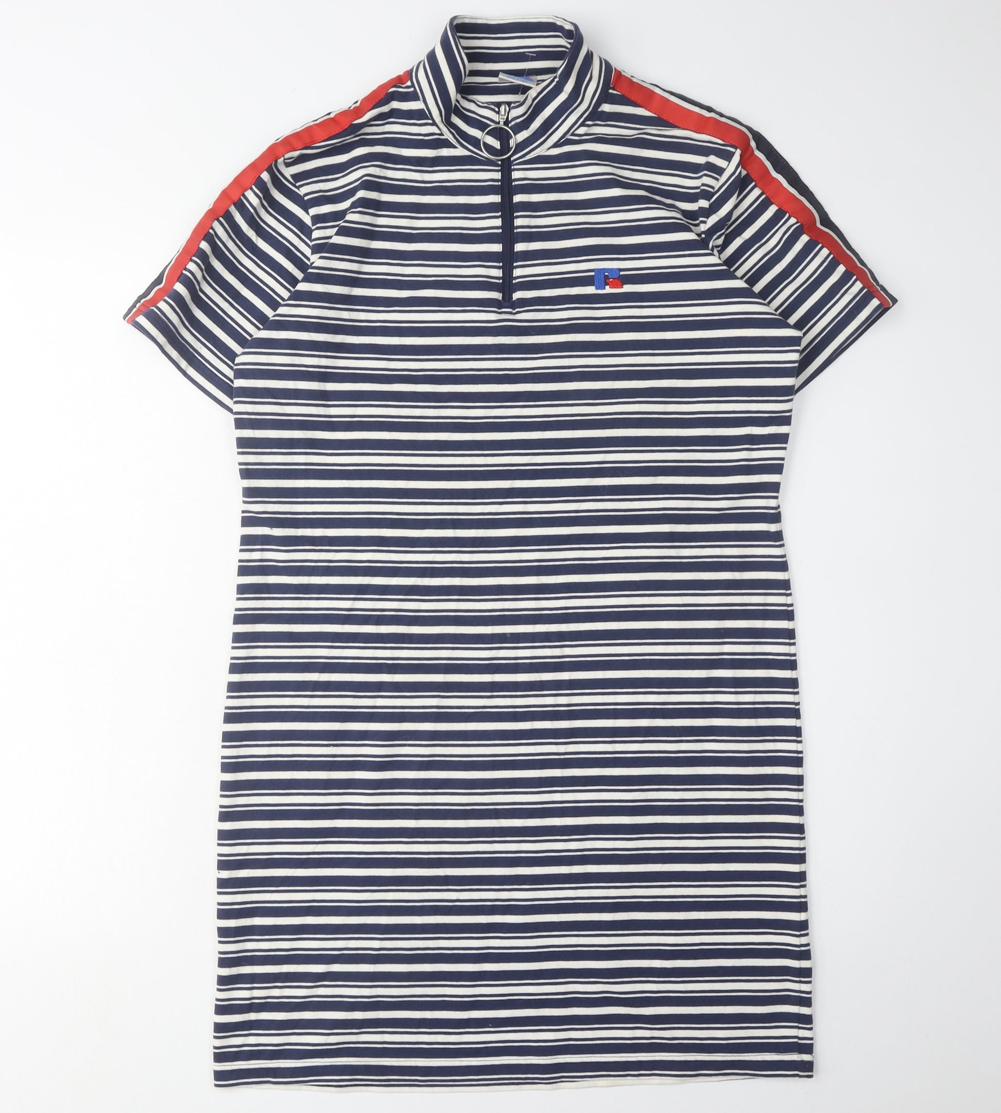 This stylish Russell Athletic Women's T-Shirt Dress combines sporty elements with a chic appeal, perfect for casual summer outings. Featuring a multicoloured striped pattern, this dress effortlessly blends style with comfort. Made from a soft and durable jersey fabric, the dress includes 95% cotton and 5% elastane for a comfortable stretch fit. Designed with short sleeves and a high neckline, it gives a nod to athleisure with its casual yet refined silhouette. Ideal for a laid-back occasion, this dress is accented with a subtle logo and stripes that enhance its sporty theme. Easy to care for with machine washability, it's both practical and fashionable. Whether you're strolling through the park or heading for a casual meet-up, this T-Shirt Dress by Russell Athletic is a versatile addition to your wardrobe.
