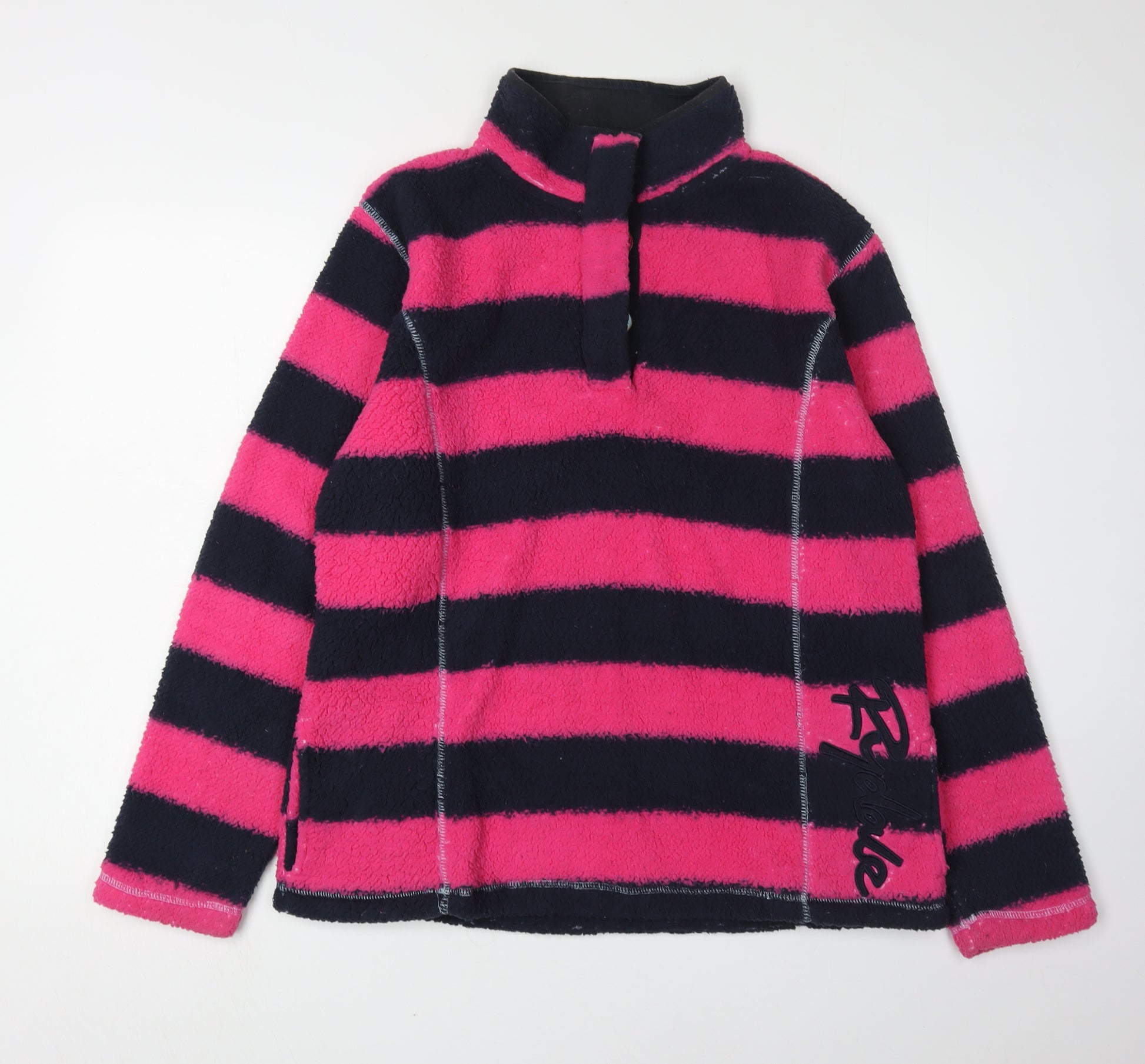 Indulge in comfort and style with this vibrant Rydale women's pullover sweatshirt. Designed in a striking pink and blue striped pattern, this fleece-crafted garment is perfect for autumn and winter outings. Offering warmth and flair, it features a cosy high neck and long sleeves, providing a snug fit against chillier days. The convenient half-zip closure adds functionality while exhibiting a trendy look. Accentuated by a logo detail, this regular-fit sweatshirt is ideal for casual occasions. Made from 100% polyester, it ensures easy machine washing, allowing for hassle-free garment care. Elevate your everyday wardrobe with this graphic print sweatshirt that promises not just warmth but a pop of colour to brighten any day.