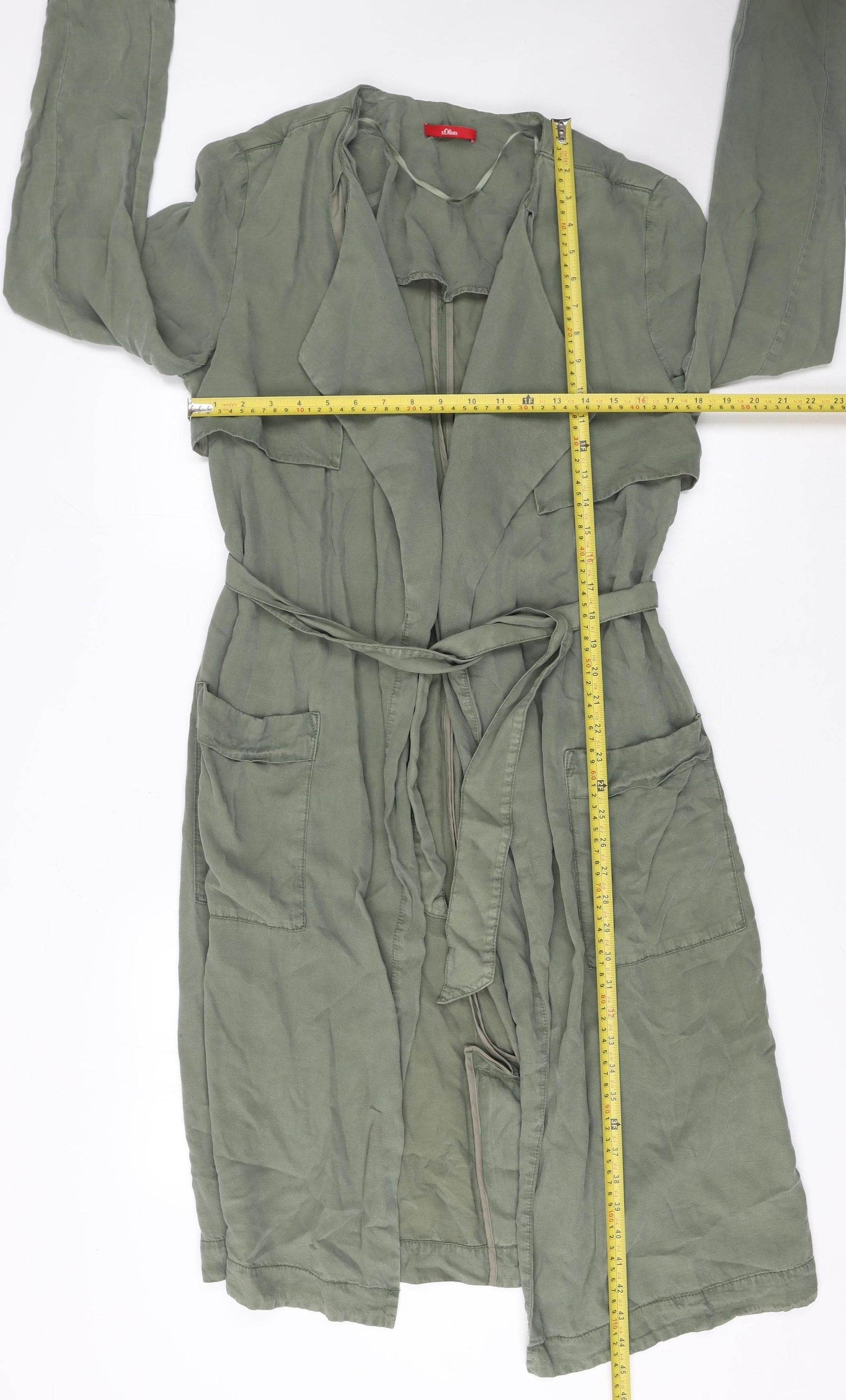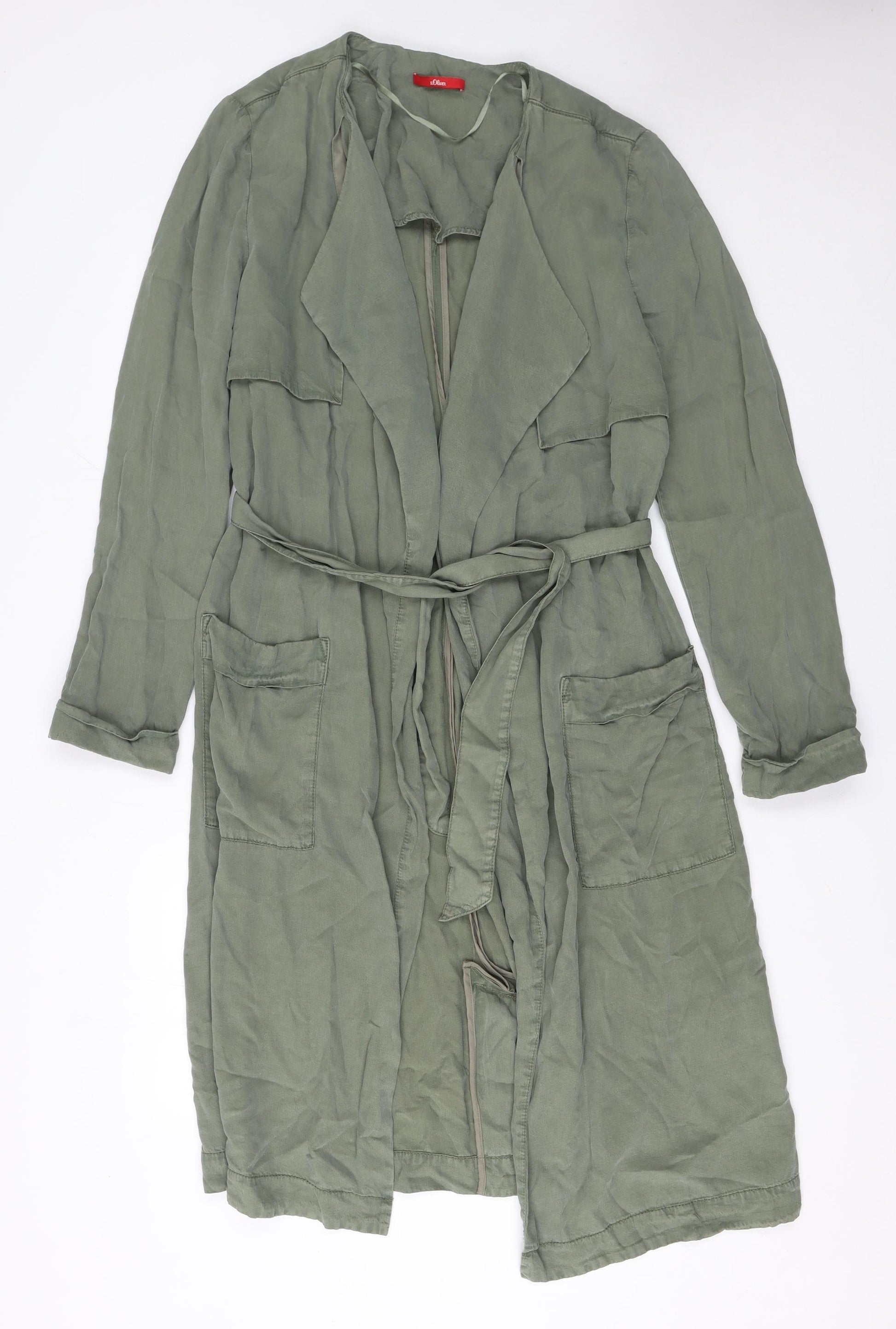 Elevate your wardrobe with this effortlessly chic s.Oliver Women’s Trench Coat in a soft, muted green tone. Beautifully crafted from 100% Lyocell, this coat offers a luxurious drape while remaining lightweight and breathable — ideal for layering during transitional seasons like spring and autumn. The natural Lyocell fabric provides a comfortable, eco-conscious alternative to cotton, giving it a soft touch and fluid silhouette that flatters the figure.Designed with modern simplicity in mind, this long-length trench coat features a relaxed fit and an open front complemented by a matching self-tie belt that cinches the waist for a flattering, feminine shape. The large lapel collar adds classic structure, while the practical front patch pockets elevate functionality without compromising style. The khaki green shade makes it versatile for both everyday casual wear and dressier moments, pairing perfectly with denim, tailored trousers, or dresses.This s.Oliver piece embodies understated sophistication with practical features such as a breathable fabric and easy open design, ensuring maximum comfort through seasons of varied weather. A timeless wardrobe addition, the belted wrap style offers both comfort and on-trend appeal. The coat’s unlined construction makes it especially suitable for mild climates or for layering under heavier outerwear during colder months.Perfect for the modern woman seeking a combination of style and comfort, this coat transitions seamlessly from workwear to travel attire. Its minimal detailing and durable construction ensure long-lasting wear and effortless elegance. Light signs of wear are present, consistent with careful use, but it remains in very good overall condition.Whether styled casually with trainers or elevated with boots and accessories, this s.Oliver green Lyocell trench coat will complement your wardrobe year after year. A classic yet contemporary piece designed to enhance your everyday look.