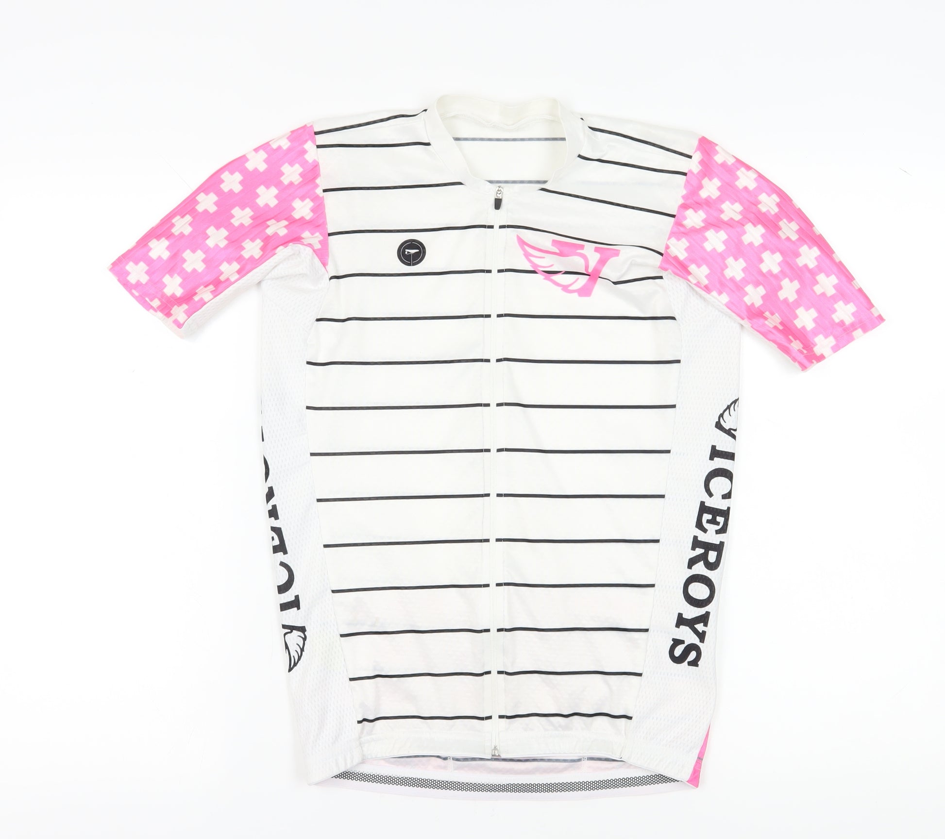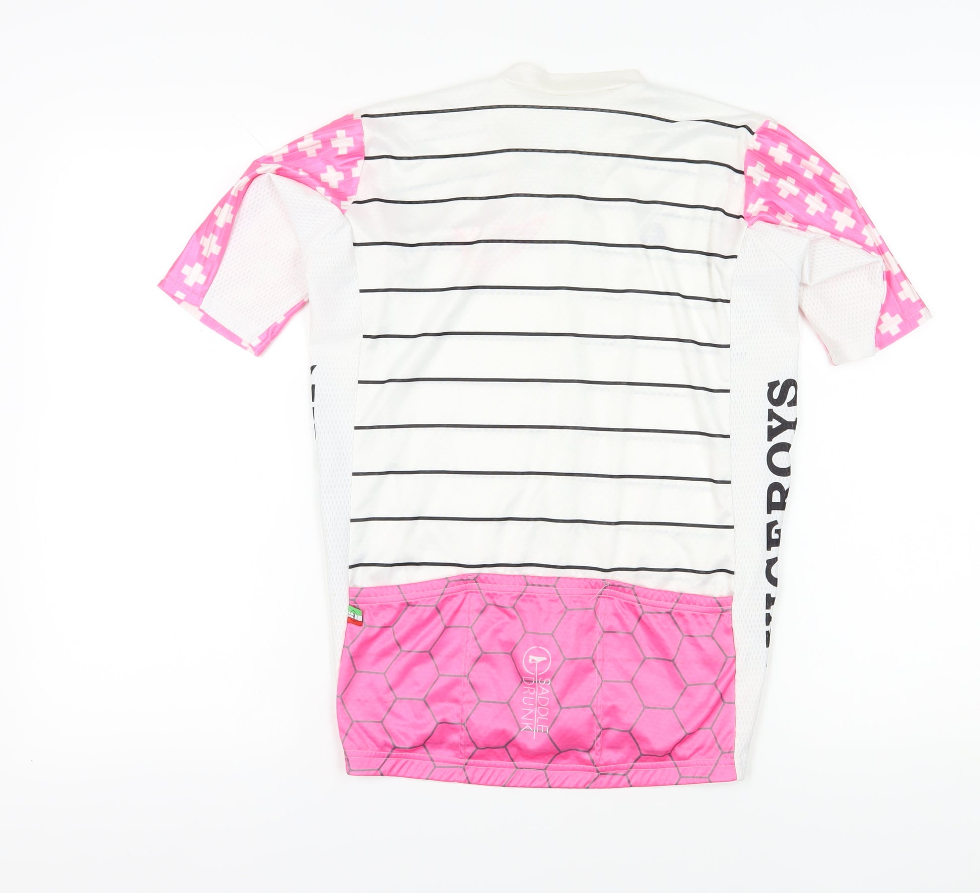 Elevate your cycling experience with this Saddle Drunk jersey, perfect for the active unisex adult. Crafted from breathable and lightweight polyester, this jersey is designed to keep you cool and comfortable during your summer rides. Featuring a vibrant pink and white striped pattern, this athletic fit jersey ensures both style and performance. The full zip closure allows for easy wearing and temperature control, while the classic short sleeves offer a full range of motion. Perfect for cycling enthusiasts, this jersey is machine washable for effortless care. Made in Italy, it promises quality and durability. Ideal for your activewear collection, don't miss out on this excellent condition piece that's ready to accompany you on your cycling adventures.