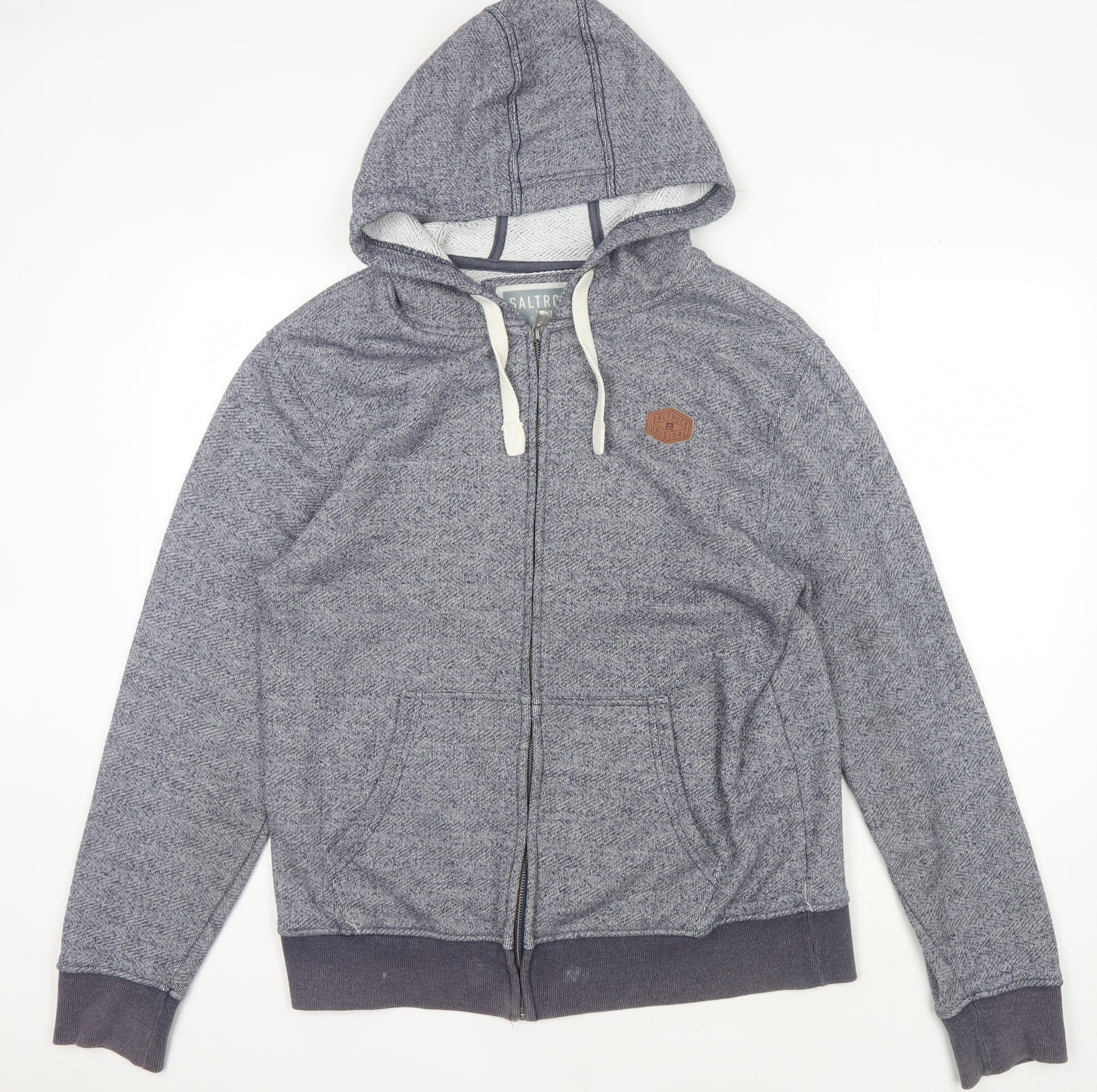 Explore casual comfort with the Saltrock Men's Grey Full Zip Hoodie, perfect for the cooler seasons. This stylish piece offers a full zip closure and is crafted from a durable blend of 60% cotton and 40% polyester, ensuring long-lasting comfort and resilience. The hoodie features a classic grey colour with a subtle herringbone pattern, adding a touch of elegance to the relaxed design.Ideal for men, this hoodie is tailored for a regular fit that pairs well with various casual outfits. The hoodie is equipped with practical features such as a drawstring hood and two front pockets, making it a useful addition to your wardrobe for autumn and winter. The Saltrock logo accentuates the hoodie, offering a nod to quality craftsmanship.Perfect for everyday wear, this machine washable hoodie is easy to care for and maintain, making it a suitable choice for those who love hassle-free fashion. Despite being in excellent used condition, you will find minimal signs of wear, presenting as nearly new.Whether you're lounging at home or heading out for an adventure, this Saltrock hoodie provides the warmth and style you crave. Grab yours today and enjoy the seamless blend of functionality and fashion.