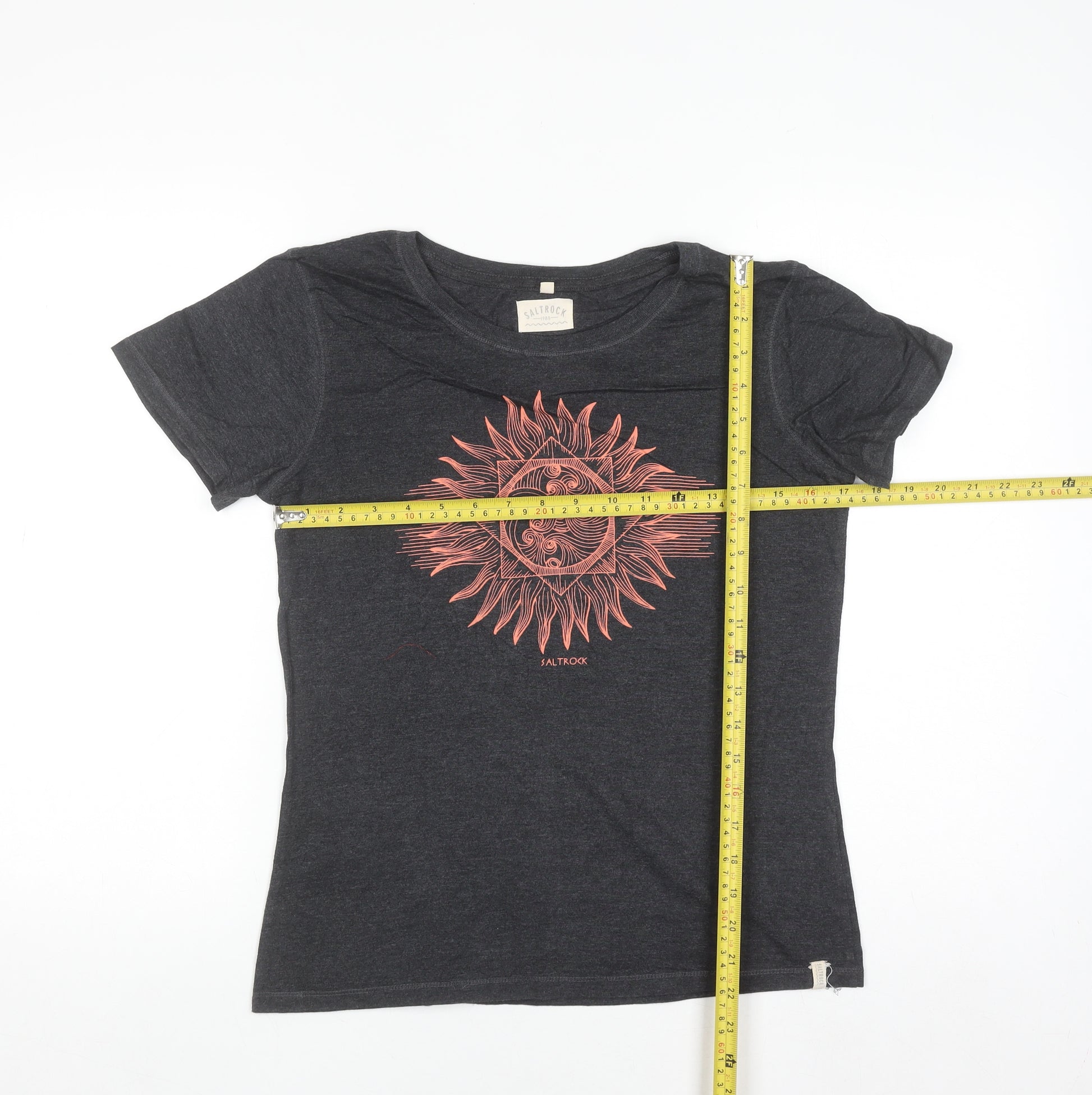 This Saltrock Women's Grey Sun Graphic T-Shirt in size 12 is the perfect blend of style and comfort for everyday wear. Designed in England and made in India, it’s crafted from a soft blend of 60% cotton and 40% polyester, delivering breathable comfort and a naturally lightweight feel. The jersey fabric ensures flexibility and durability, keeping this tee a long-lasting wardrobe essential. The deep charcoal grey base provides a versatile backdrop for the striking coral-orange sun graphic printed on the chest, showcasing Saltrock’s signature surf and adventure-inspired aesthetic. Featuring short sleeves and a classic crew neckline, this top offers a timeless, flattering silhouette suitable for layering under hoodies or wearing alone in warmer weather. The regular fit allows for easy movement while maintaining a neat outline. Ideal for casual outings, beach days, travelling, or relaxed weekends, this T-shirt captures laid-back coastal vibes with effortless charm. Its breathable and easy-care design makes it a practical addition to any woman’s casual clothing collection. The condition is excellent, showing light previous wear but free from any major marks or damage. Pair it with jeans, shorts, or leggings for a comfortable and stylish everyday look. This Saltrock women’s shirt combines seaside inspiration with comfort, making it an excellent choice for relaxed fashion lovers seeking quality and authentic design. Whether worn to the beach, a casual meet-up, or a summer festival, it delivers both versatility and character in one simple piece. A reliable staple that embodies Saltrock’s distinctive, easy-going British surfwear appeal. Don’t miss the opportunity to add this effortlessly cool T-shirt to your collection today.
