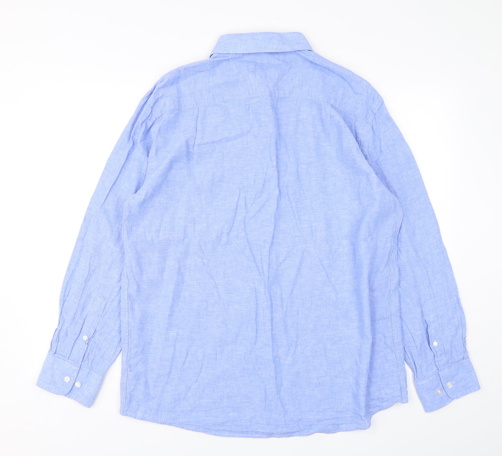 Mens Blue Linen Button-Up Size L Collared Button