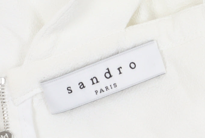 Enhance your wardrobe with this elegant Sandro camisole tank top. Designed for the modern woman, this white tank top is perfect for any casual occasion during the warm spring and summer months. Featuring a flattering square neckline and wide straps, this sleeveless top offers a chic and stylish look that pairs perfectly with jeans or a skirt. Made from 100% viscose, the fabric ensures a comfortable and breathable fit. The full zip at the back adds a touch of sophistication, making it easy to wear and remove. Its regular fit and size 4 ensure a flattering silhouette for any figure. Despite slight wear, the top remains in excellent condition, offering great value at an affordable price. Embrace the simplicity and style of this solid patterned camisole and make it a staple in your spring and summer collection.