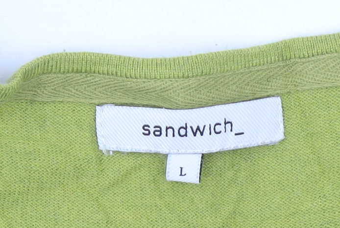 This stylish women's pullover jumper from Sandwich offers a versatile piece perfect for casual wear and travel. Designed in a fresh and striking green colour, this relaxed-fit knit jumper provides both comfort and a modern silhouette. Made with a V-neckline and dolman-style three-quarter length sleeves, it strikes a balance between effortless chic and everyday practicality. The lightweight knitted construction ensures breathability, making it an excellent option for spring, autumn, and even cooler summer evenings. Crafted from a blended fabric that includes 6% wool, 20% polyamide, 39% polyester, and 35% acrylic, this top achieves a balance of softness, durability, and easy care. The mix of fibres provides a relaxed drape on the body while remaining machine washable for added convenience. Its tight-knit finish gives structure to the piece while retaining a comfortable relaxed fit that flatters different body shapes. Perfect for layering, the jumper can be worn casually with jeans and trainers or dressed up with skirts and smart trousers for a more polished look. Whether worn to a brunch outing, travelling, or as a relaxed everyday staple, the versatility of this Sandwich design makes it an essential addition to any wardrobe. The clean, minimalist finish allows the colour to take centre stage, creating an understated yet stylish impact. Condition is very good with only light signs of wear and some creasing consistent with gentle use but no flaws that affect the wearability or appearance of the garment. This is a pre-loved piece priced thoughtfully to offer excellent value for a high-quality brand like Sandwich. Add this relaxed-fit, green pullover jumper to your wardrobe for an easy-to-style go-to option that can transition seamlessly between casual and smart-casual looks.
