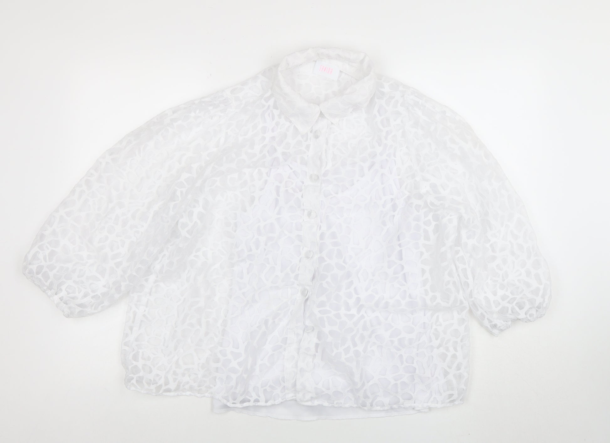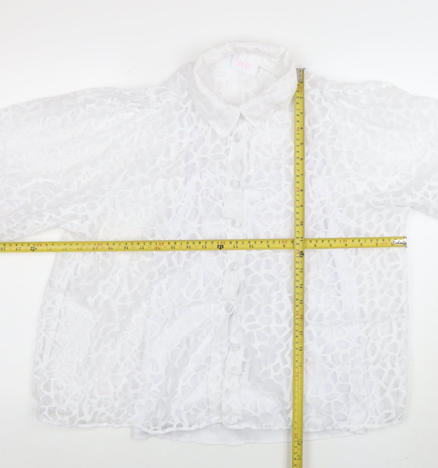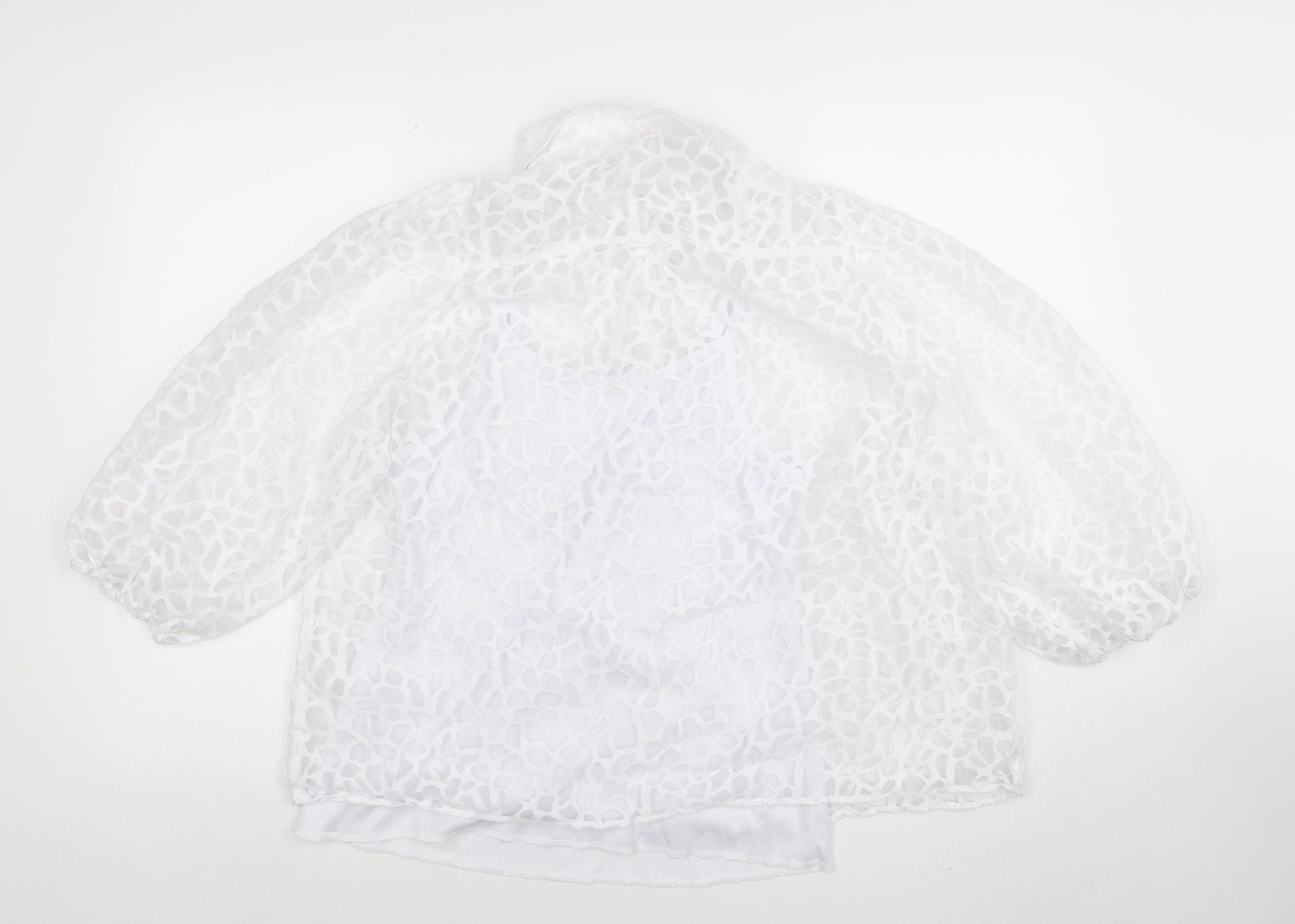 Elevate your wardrobe with this charming white blouse from Saviion, designed to bring effortless sophistication to your everyday looks. Crafted in 100% polyester lace fabric, this blouse features a delicate sheer overlay with a geometric cut-out pattern that creates a light, airy feel, perfect for spring and summer wear. The relaxed fit ensures comfortable all-day wear, while the 3/4 puff sleeves add a soft touch of volume and a hint of romantic flair. A classic collared neckline and full button front give it a smart yet feminine silhouette, making it versatile enough for both casual and semi-formal occasions. Ideal for pairing with tailored trousers or jeans, this blouse transitions seamlessly from work hours to evening outings. Its breathable, lightweight material provides all-season comfort, while the beautiful textured finish adds a stylish twist to your wardrobe staples. The elegant design is enhanced by its refined white tone, exuding modern simplicity and timeless appeal. Whether styled for a brunch date, a summer event, or a day at the office, this Saviion blouse offers versatility and effortless chic. Its quality construction and refined detailing ensure it maintains both form and function. Perfect for women who appreciate a blend of feminine detail and everyday wearability, this piece is a must-have for anyone seeking something special yet understated. In excellent pre-owned condition, this blouse shows no visible signs of wear, making it a fantastic addition at an even better price. An elegant staple that captures contemporary sophistication with classic charm.