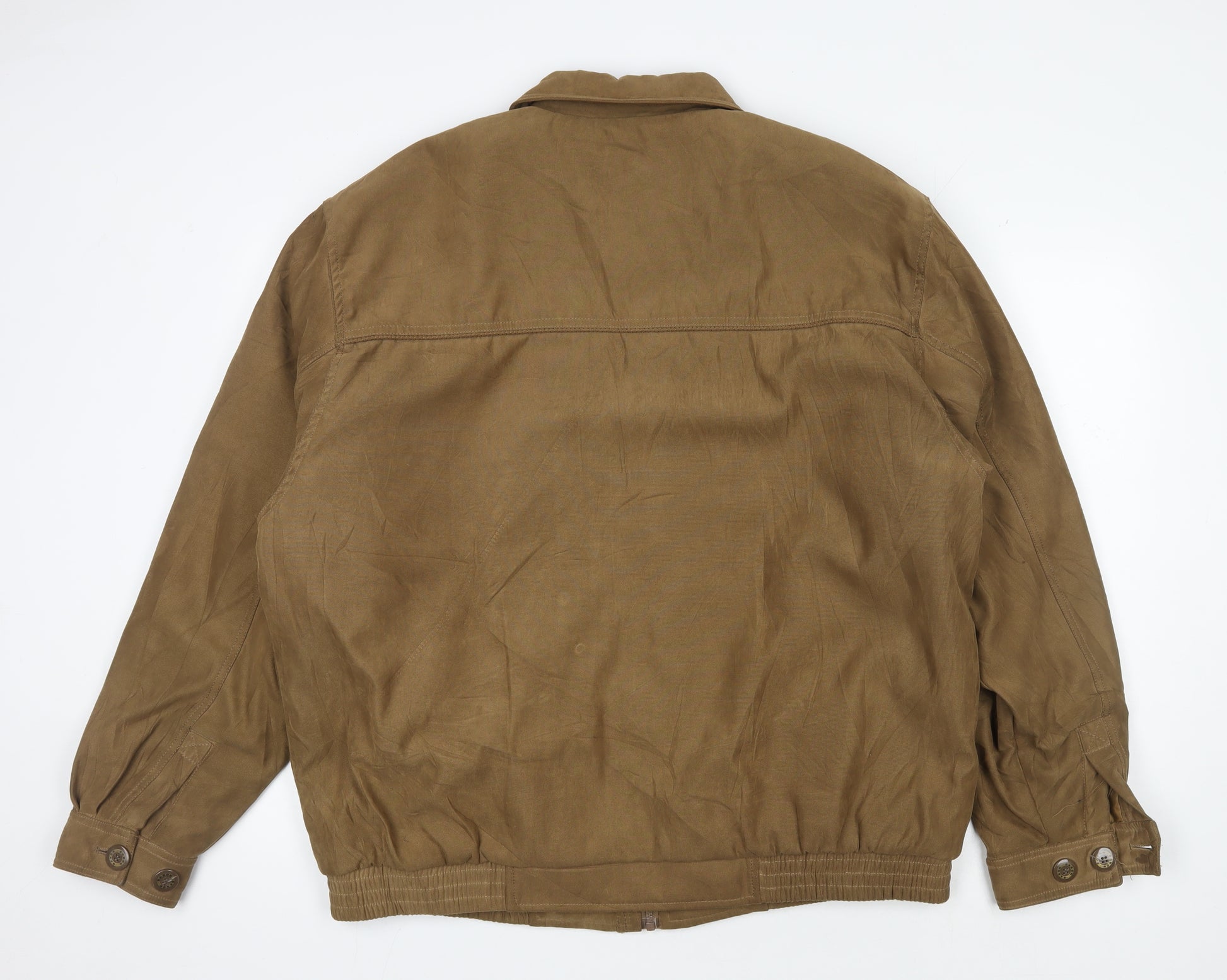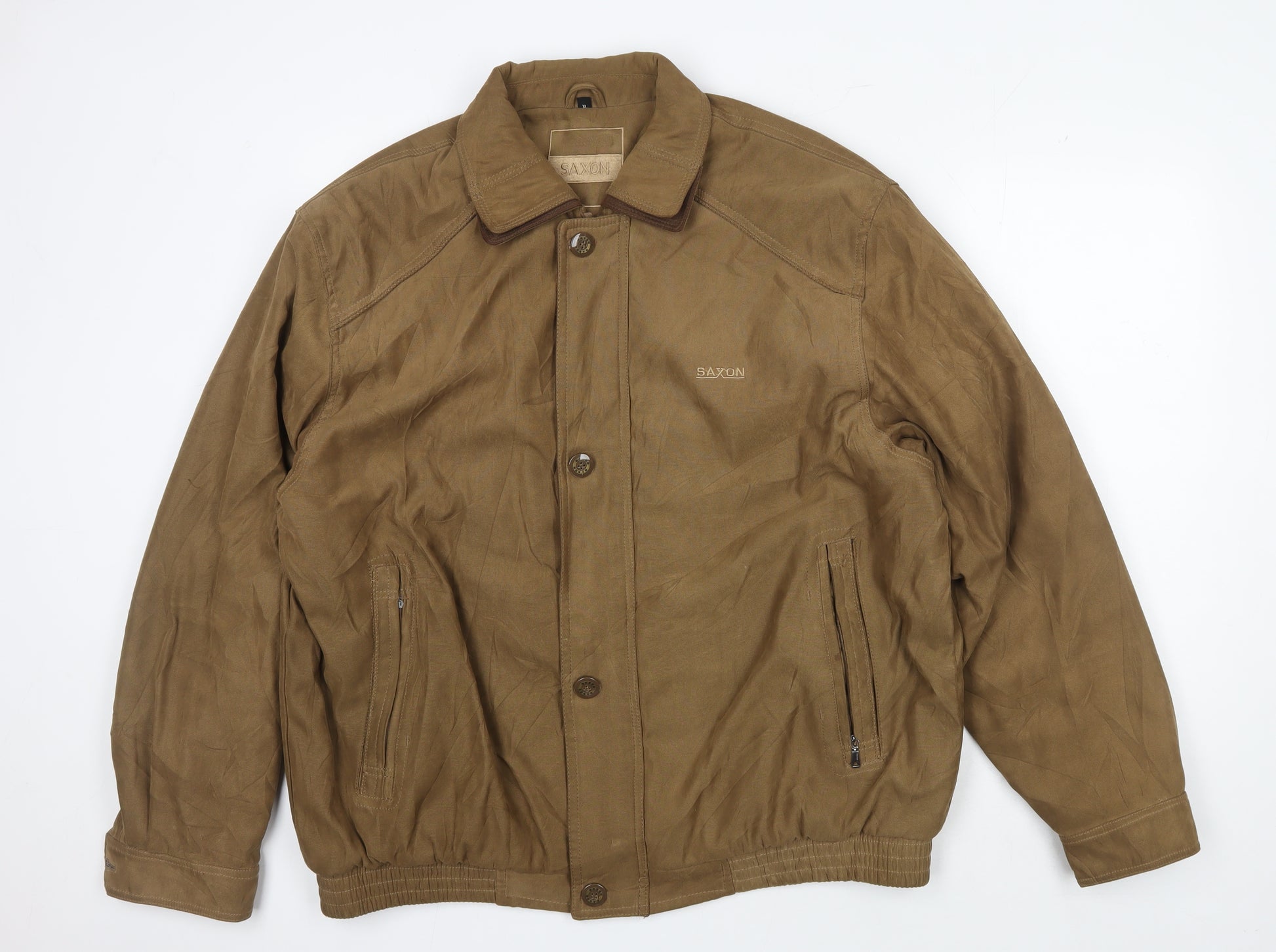 Introducing the Saxon Men's Bomber Jacket, a perfect blend of style and comfort designed for casual wear. Crafted with an outer shell made from durable Terelyne and Nylon, this jacket offers a robust yet lightweight feel. Its sleek brown hue complements a range of outfits, making it a versatile addition to your wardrobe. Featuring a classic collared design and practical zipped pockets, it's ideal for keeping essentials secure while maintaining a streamlined silhouette. The jacket's button and zip closure ensure a secure fit, while its polyester lining provides a soft layer of warmth, perfect for those crisp autumn and winter days. With distinctive embroidered Saxon branding, it adds a touch of subtle elegance. Although in excellent condition with minimal signs of wear, it's ready to offer you lasting style and comfort. This regular fit piece is machine washable, ensuring easy care and maintenance. Elevate your everyday look with this superb Saxon bomber jacket.
