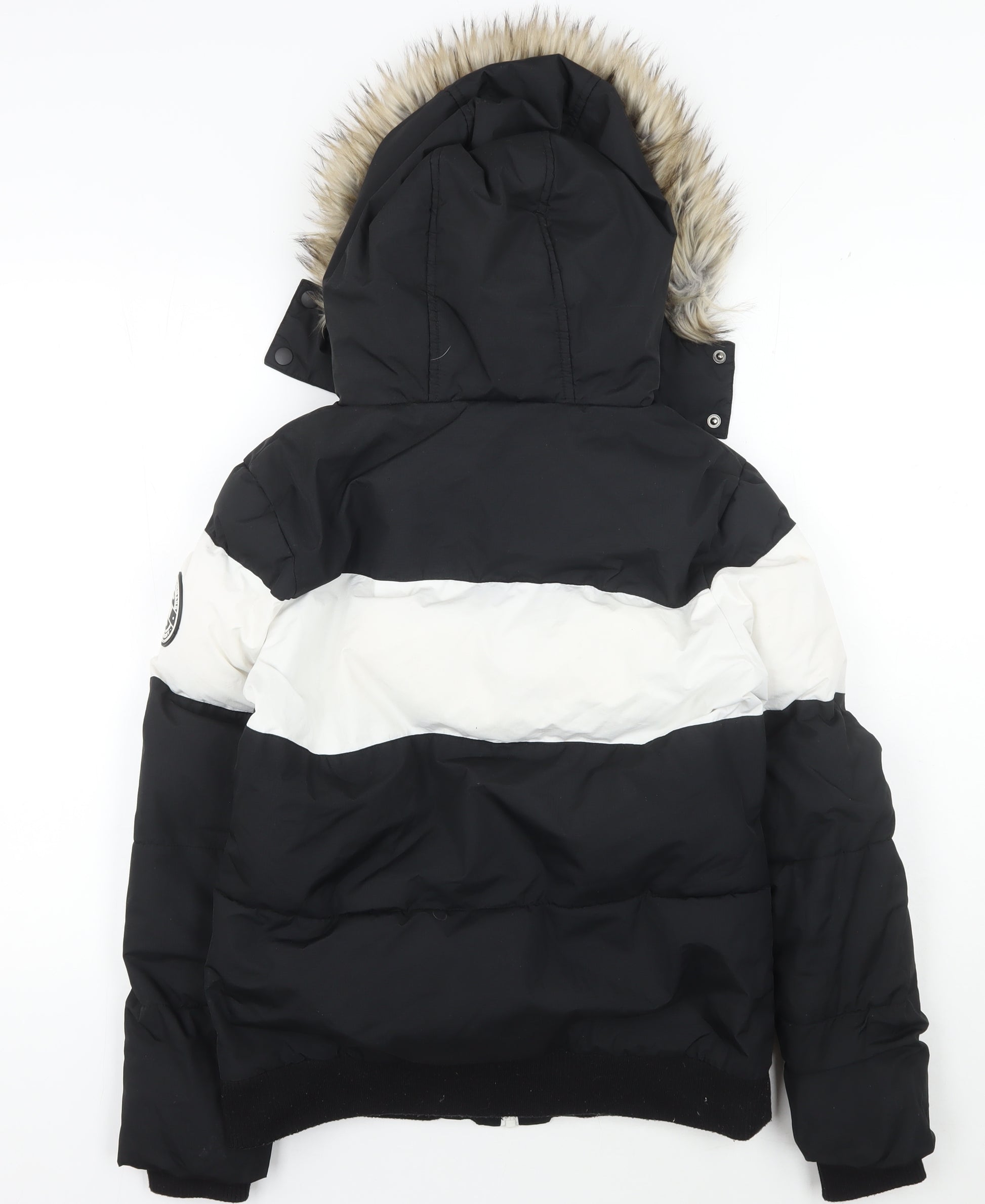 Stay cosy and stylish this winter with this SDNY Women's Puffer Jacket. Crafted in a striking black and white colourway, this jacket combines fashion with functionality. Ideal for the colder months, its warm polyester insulation ensures you remain toasty whilst looking chic. The jacket features a convenient zip closure and fur-trimmed hood, offering both warmth and a touch of elegance. Perfect for casual occasions, its practicality is enhanced by zipped pockets to keep your essentials secure. Available in a size 6, its regular fit ensures comfort while flattering your silhouette. This jacket is machine washable, making it easy to care for, and is in excellent condition, showing no visible defects. Embrace winter in style with this versatile and appealing jacket, designed to complement any wardrobe.