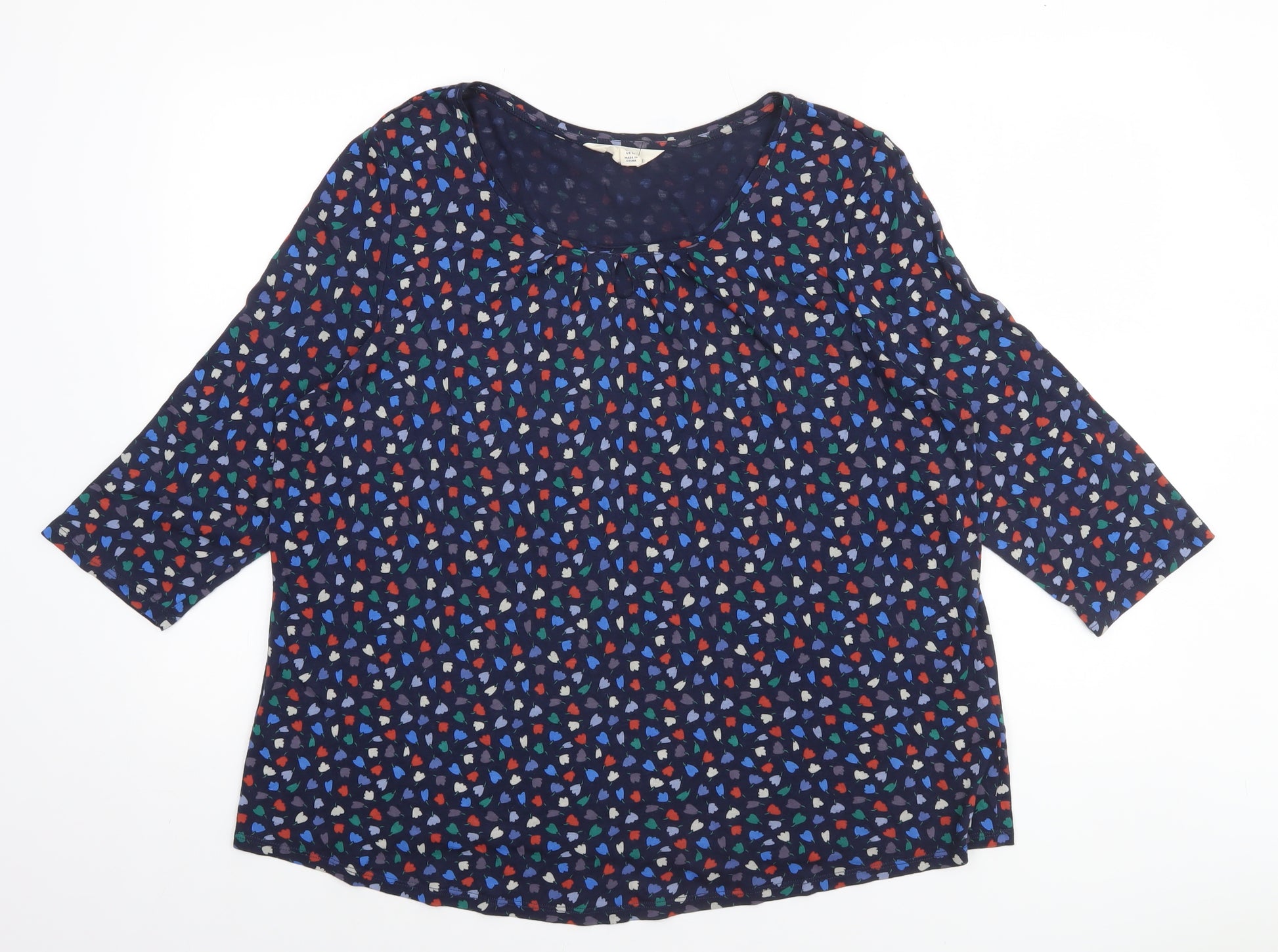 This lovely Seasalt Cornwall women’s blouse is a beautiful example of casual comfort mixed with charming coastal style. Designed in a soft, breathable fabric blend of 70% bamboo and 30% organic cotton, it feels lightweight and naturally comfortable against the skin. The fabric’s bamboo content provides an eco-friendly, moisture-wicking touch, making it ideal for wear across spring, summer, and into autumn. The relaxed fit offers an easy drape that flatters the figure, while the smooth jersey fabric ensures freedom of movement and a naturally soft finish. The blouse comes in a rich navy base, scattered with a lively multicoloured floral print – a charming mix of red, blue, green, and ivory tones that bring out its joyful, easygoing personality. Designed with a scoop neckline and 3/4 length sleeves, it delivers an effortlessly feminine silhouette that works well on its own or layered with your favourite cardigan or jacket. The pullover style keeps it simple and easy to wear, suitable for everyday use or more relaxed weekend outings. Comfortable and versatile, this piece pairs perfectly with jeans, linen trousers, or skirts for an instantly put-together yet laid-back look. Ideal for casual occasions, travel, or even relaxed office wear, its breathable bamboo and organic cotton blend ensures comfort from day to night. Carefully checked to be in excellent pre-owned condition, this blouse shows no visible signs of wear or damage, maintaining its quality feel and vibrant colours. For lovers of sustainable, beautifully made clothing with a touch of Cornish charm, this Seasalt Cornwall top is a wardrobe essential that blends timeless appeal, practicality, and eco-conscious craftsmanship. Add a splash of cheerful, ethical style to your collection with this brilliant piece.