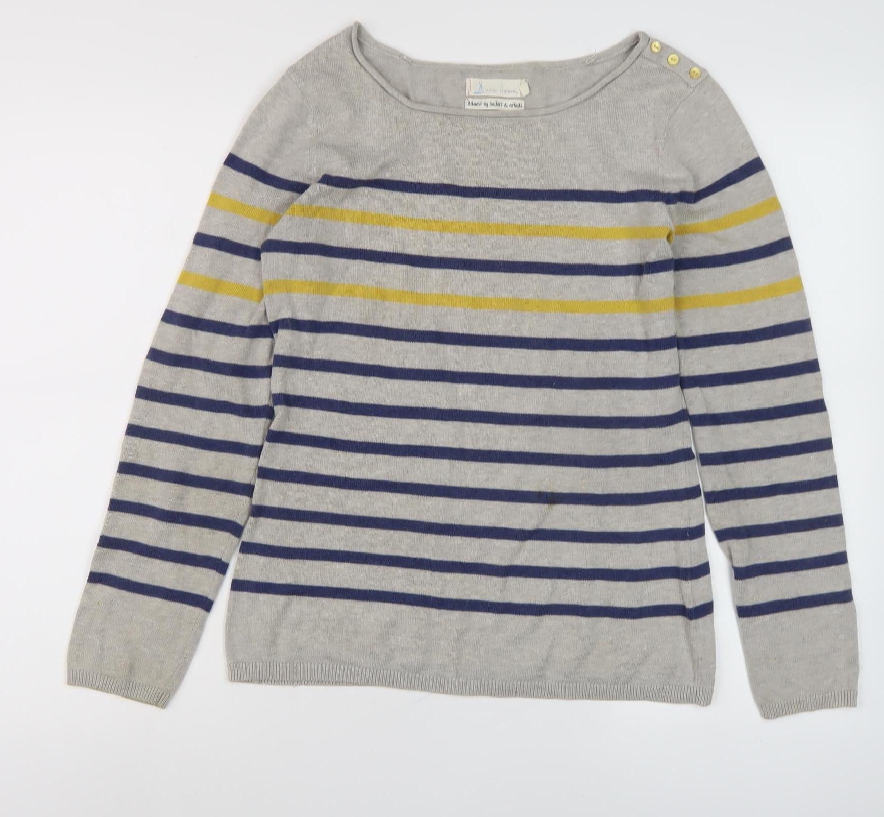 Discover refined comfort with the Seasalt Cornwall Women's Grey Pullover Jumper. This striped pullover combines a casual aesthetic with a touch of elegance, making it perfect for any wardrobe. Crafted primarily from soft cotton, this knit jumper offers breathability and warmth, ideal for cooler autumn and winter days. The boat neck adds a touch of sophistication, while the long sleeves ensure optimal coverage and comfort. Designed with a stylish striped pattern in subtle shades of grey, it's easy to pair with various outfits for a versatile look. The jumper features a button accent on the shoulder, adding a unique edge to its classic design. While it is in very good condition, please note a slight stain on one of the stripes, a minor imperfection given its charming appeal. Keep cosy and chic whether you're heading for a casual day out or enjoying a relaxing evening indoors. Embrace the timeless style and soothing warmth of this exquisite pullover by Seasalt Cornwall, tailored for the contemporary woman.