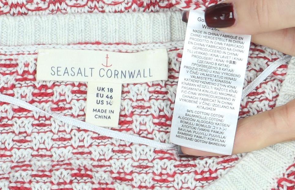 This beautiful Seasalt Cornwall women's pullover jumper is a relaxed and stylish piece ideal for both spring and summer wear. Crafted from a soft, breathable blend of cotton and bamboo, it offers a lightweight and comfortable fit perfect for layering or wearing on its own. The jumper features a charming red and cream geometric knit pattern that provides subtle texture and visual interest, making it an easy match with jeans, chinos, or skirts for effortless casual styling. Its crew neckline and short sleeves create a flattering shape while maintaining classic comfort, and the ribbed trims at the collar, hem, and cuffs ensure a neat finish that holds its shape. The relaxed fit allows free movement, enhancing comfort throughout the day without sacrificing elegance. Designed with quality and durability in mind, the fabric’s natural fibres make it soft against the skin and breathable, perfect for keeping cool while maintaining a refined look. As a brand, Seasalt Cornwall is known for its coastal-inspired touches and sustainable materials, reflecting a timeless charm that complements many wardrobes. Whether you're spending a day exploring the seaside, enjoying a casual lunch, or relaxing at home, this jumper brings understated style and comfort to any setting. Though pre-owned, it is in excellent condition with no stains, holes, or damage visible, ready for many more wears. Its easy-care, machine-washable fabric ensures low maintenance while lasting beautifully season after season. A versatile choice for women who value high-quality, classic British style and comfort, this red and cream knit Seasalt Cornwall jumper will become an everyday essential for effortless yet chic dressing.