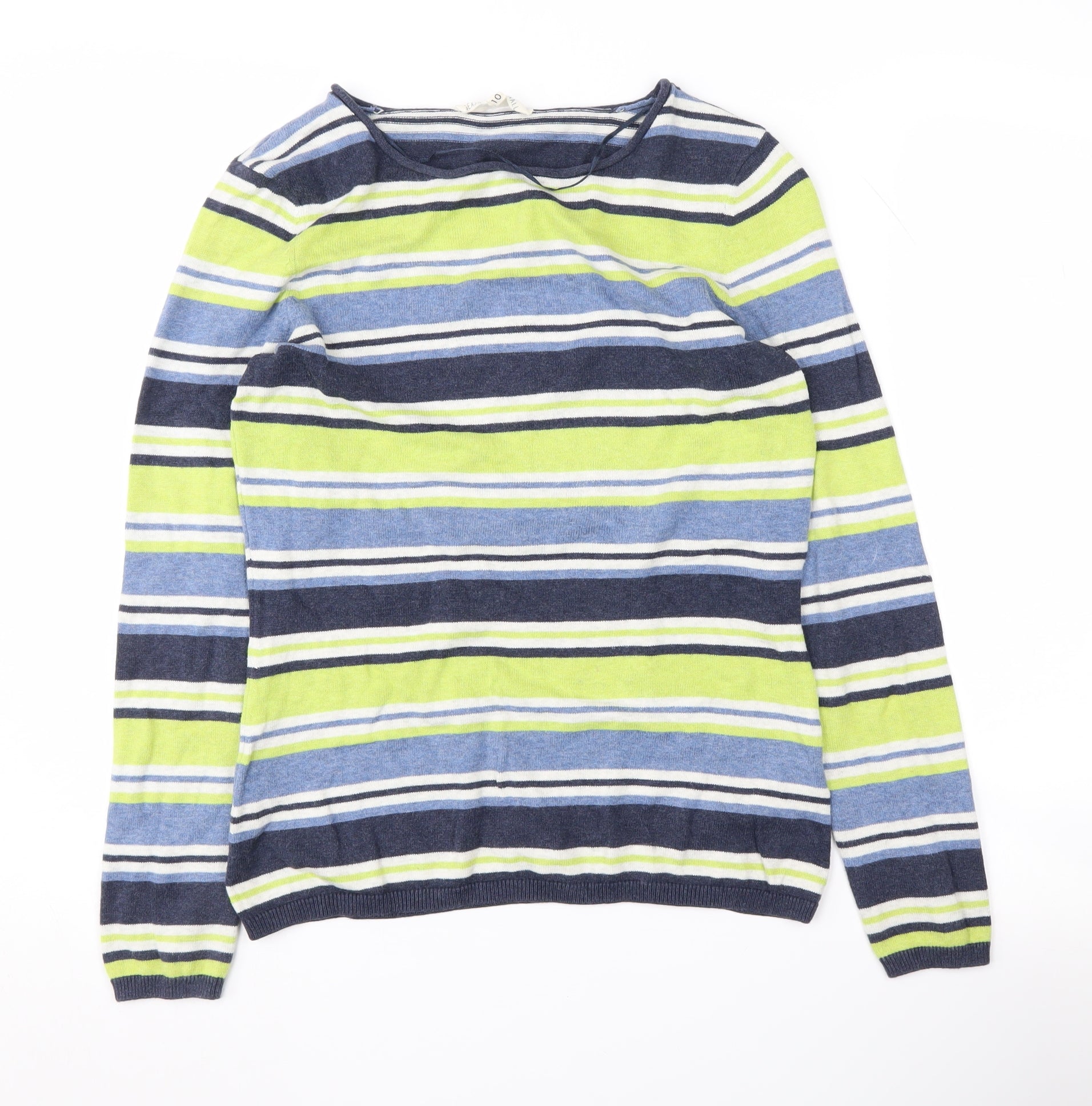 Brighten up your wardrobe with this cheerful Seasalt Cornwall jumper. Crafted from 100% cotton, this jumper offers both comfort and breathability, making it a perfect choice for year-round casual wear. Designed in a vibrant multicoloured striped pattern, it promises to inject a dose of fun and energy into your outfit. The jumper features a flattering boat neck and raglan long sleeves, enhancing its laid-back appeal while keeping you cosy and stylish. The regular fit ensures ease of movement and a relaxed silhouette, ideal for pairing with your favourite jeans or trousers. Sized as a UK 10, it reflects the authentic design aesthetics of Seasalt Cornwall, known for quality craftsmanship. Machine washable for easy care, this piece is made to be loved and worn timelessly. Whether you’re off to brunch or running errands, this jumper will quickly become a staple in your casual collection. An excellent condition assures there's no visible damage, just a playful piece ready to be worn time and again. Add this lively jumper to your collection and enjoy stepping out in style.
