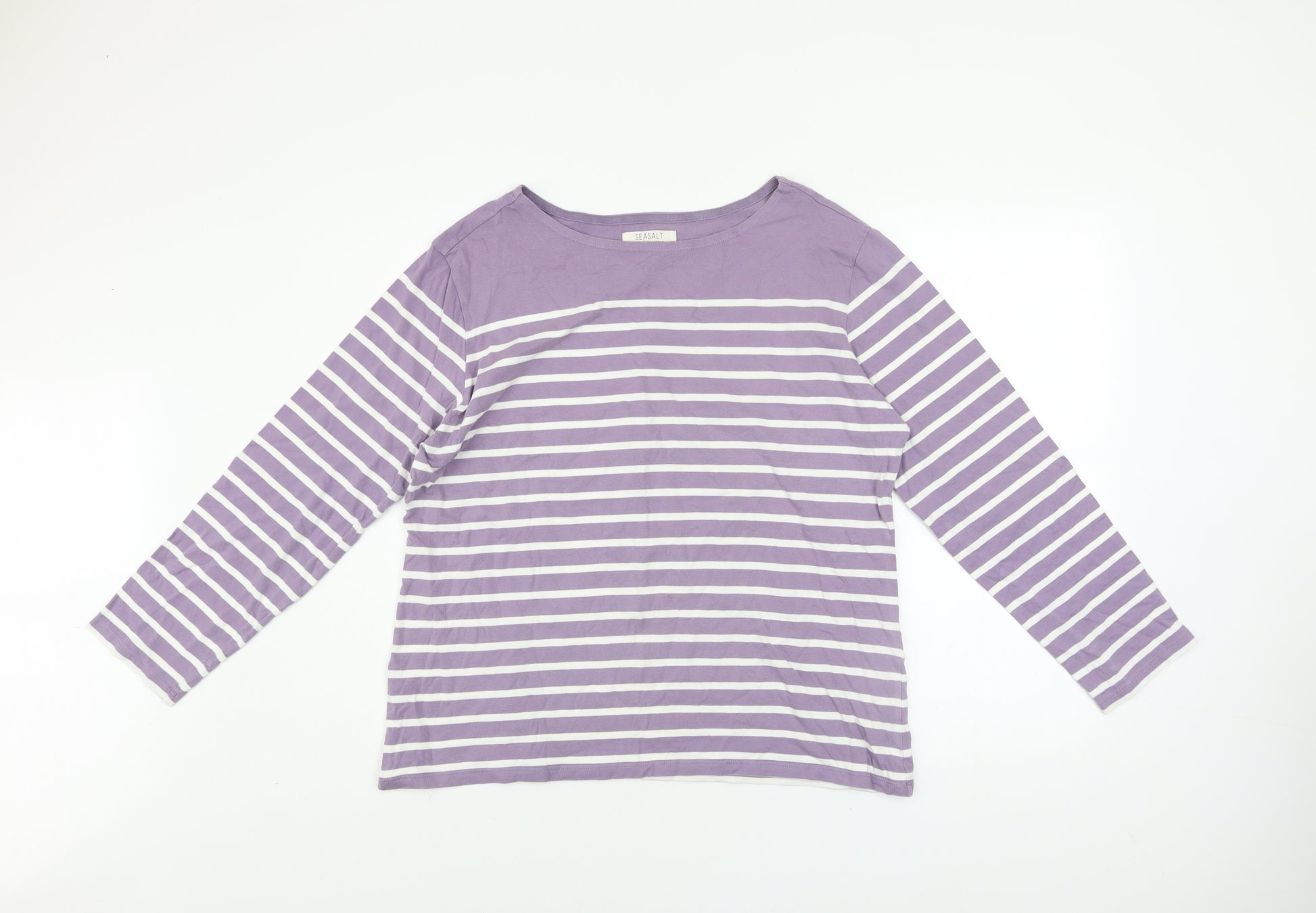Add a touch of relaxed coastal charm to your wardrobe with this lovely Seasalt Women’s Sailor Shirt in a soft purple and white stripe design. Crafted from 100% organic cotton jersey, this top offers both comfort and sustainability. The breathable fabric ensures all-day ease, making it perfect for layering or wearing alone through the warmer months. Designed with a flattering boat neckline and long sleeves, this top balances casual elegance with everyday practicality. The classic striped nautical styling makes it timeless and versatile to pair with jeans, linen trousers or a summer skirt. Its regular fit provides a comfortable silhouette without feeling tight, offering a laid-back yet refined look for any casual outing, weekend walk or relaxed lunch. The natural cotton fabric feels gentle against the skin and is machine washable for effortless care. The purple hue adds a cheerful pop of colour while still being easy to style with your wardrobe basics. Condition is excellent with no visible flaws, showing minimal previous wear. A great choice if you’re looking for sustainable everyday wear – Seasalt’s organic cotton range is well-loved for its breathable comfort and timeless Cornwall-inspired designs. Ideal for casual days, spring afternoons, coastal holidays, or simply lounging in comfort, this long-sleeved top embodies easy-going yet stylish living. Comfortable, practical, and ethically made, the Seasalt Sailor Shirt is a perfect staple for any woman’s collection — bringing a relaxed nautical feel to your outfit with effortless charm and quality British craftsmanship.