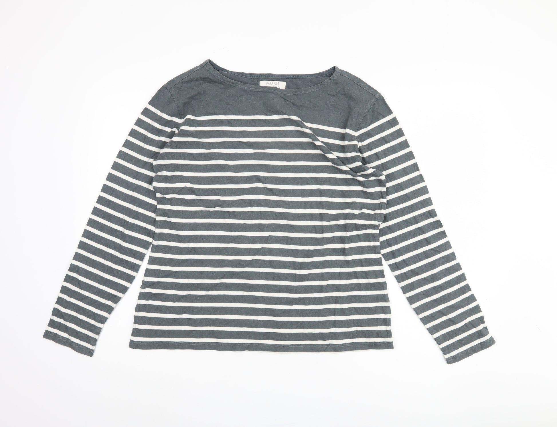 Elevate your casual wardrobe with this charming Seasalt Women's Grey Striped T-Shirt, ideal for those laid-back yet stylish days. Crafted from 100% organic cotton, this medium-weight jersey top promises comfort and breathability, perfect for wear in both spring and autumn. Its classic boat neck combined with long sleeves offers a timeless look, while the grey and white striped pattern adds a nautical flair to your ensemble. Designed with a regular fit, this top is versatile enough to be paired with jeans or a skirt, making it a go-to choice for casual occasions. The durable fabric ensures longevity, while the machine washable feature makes maintenance hassle-free. With minimal signs of wear, this pre-loved piece is in excellent condition, ready to become a staple in your collection.