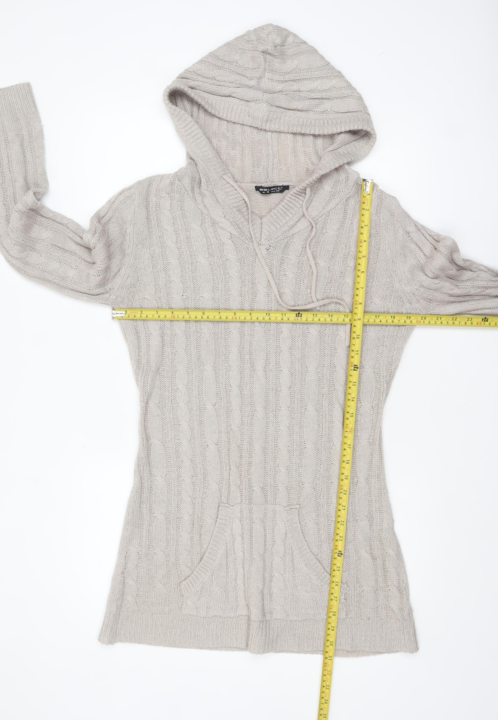 Women Beige Cable Knit Hooded Tunic Jumper Size 16