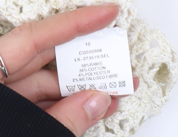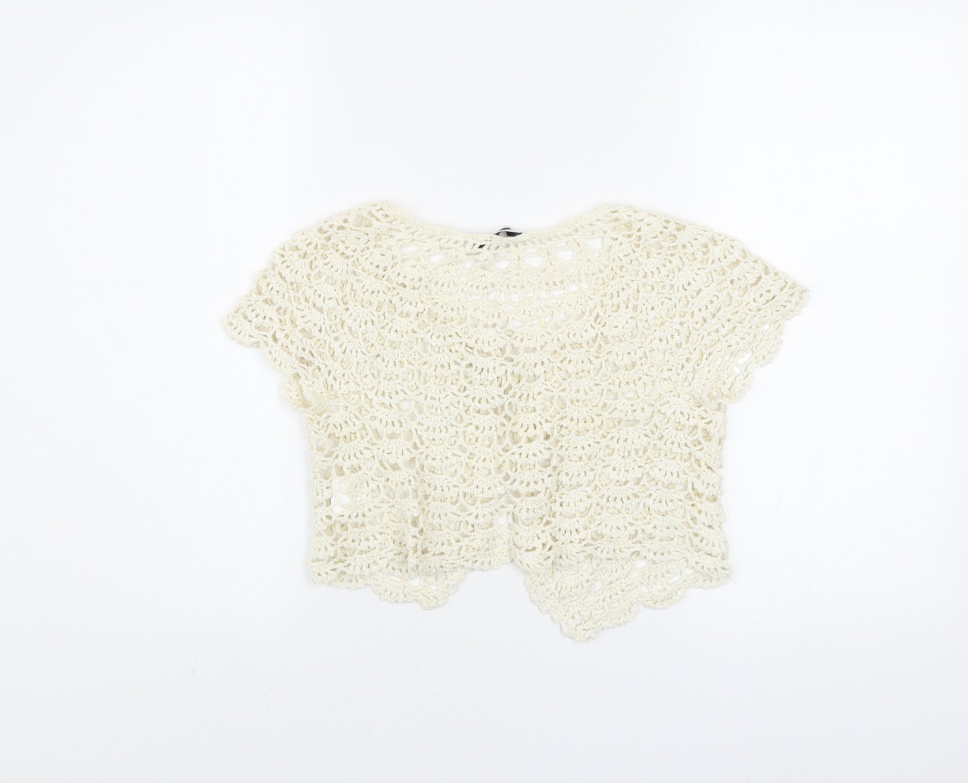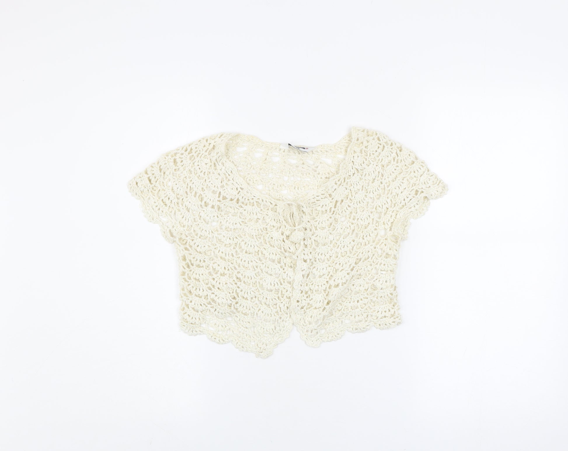 Add a touch of effortless boho charm to your wardrobe with this beautiful ivory crochet shrug by Select. Crafted in a soft open-knit fabric, this short-sleeve cardigan is perfect for layering over summer dresses or pairing with high-waisted jeans for a relaxed yet chic look. The lightweight and breathable design make it a comfortable choice for warmer days, while the subtle sparkle from its metallised fibres adds just the right hint of glamour. The shrug features a delicate round neckline and a tie front detail, offering a flattering fit that complements a variety of styles. Made from a quality blend of 58% ramie, 36% cotton, and 4% polyester, the garment provides a natural texture with added durability and softness. Ideal for spring and summer wear, this piece brings together femininity and versatility. The ivory colour ensures it pairs easily with any outfit, while the intricate crochet pattern gives a handcrafted, artisan touch. Suitable for everyday casual wear or occasions such as garden parties, outdoor events and festivals, this shrug can transition effortlessly from day to night. The open-knit design and cap sleeves make it both airy and easy to layer, lending it a timeless, easy-going appeal. In excellent pre-owned condition with minimal signs of wear and a clean overall appearance, this cardigan combines comfort, quality and style. Whether you’re completing a bohemian-inspired ensemble or simply looking for a breezy layer to elevate your look, this Select ivory crochet shrug in size 10 is a versatile must-have addition to your outfit collection for the season.