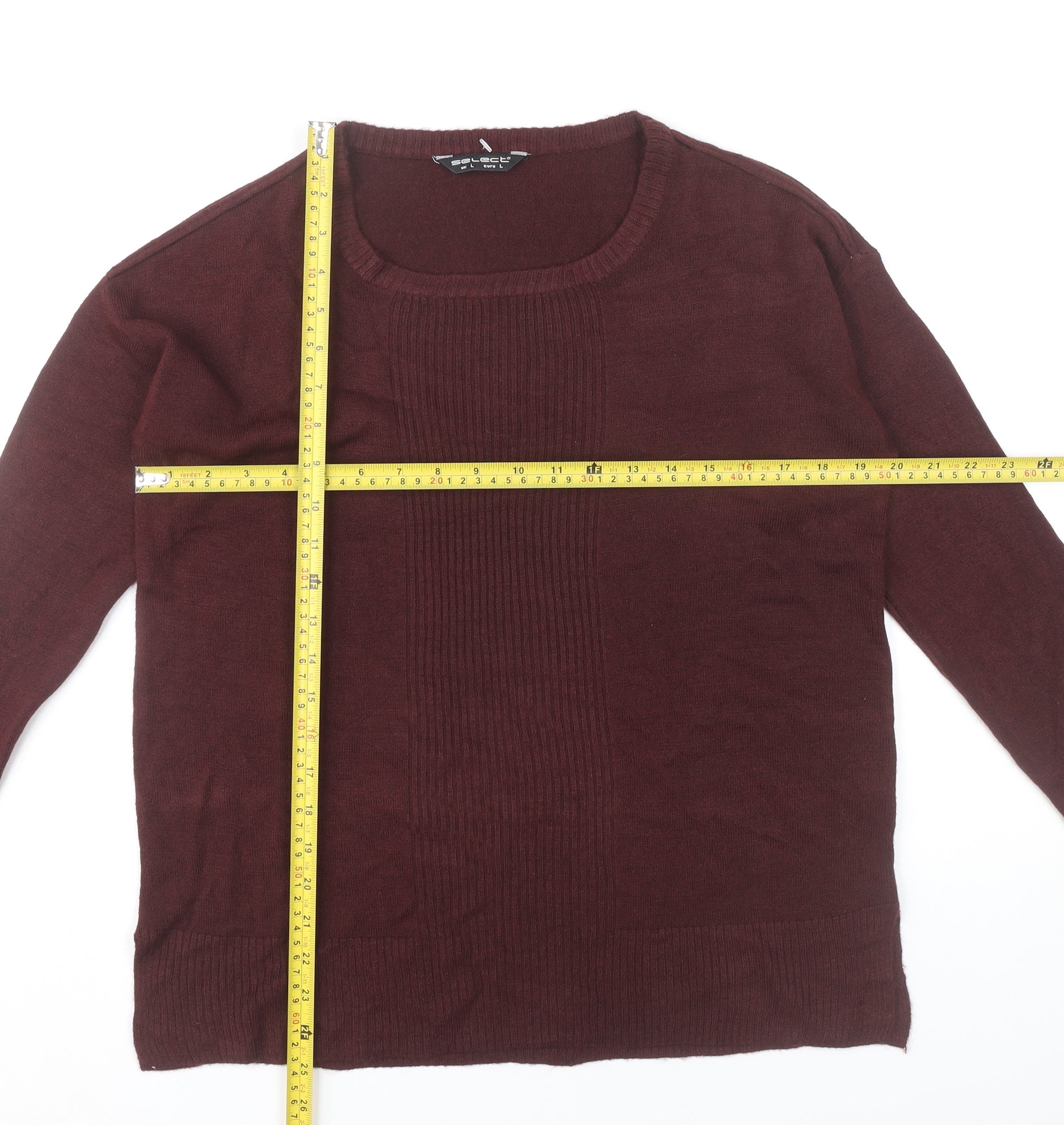 This Select women’s pullover jumper in a deep red shade is a stylish and versatile addition to any wardrobe. Designed in a flattering scoop neckline with long sleeves, it offers a smart yet relaxed look, perfect for both everyday wear and casual outings. Crafted from 100% acrylic in a tight-knit finish, it provides warmth while remaining lightweight and easy to maintain. The ribbed vertical front detail adds subtle texture, while the button accents on the sleeves give a touch of design interest. The jumper comes in a UK size L and is cut for a regular fit, ensuring comfort and ease of movement whether layered or worn on its own. The knit construction makes it an ideal choice for autumn and winter seasons, pairing well with jeans, trousers, or skirts for a polished but cosy style. Its simple and clean lines, free from heavy patterns, make it a timeless piece that can easily be dressed up with accessories or layered under coats and jackets. Machine washable for hassle-free care, this jumper is a practical option for daily wear. The rich red colour brings warmth to your outfit and is versatile enough to complement both neutral and bold wardrobe pieces. Whether you’re dressing for casual days, weekend errands, or layering for a workwear look, this Select jumper delivers both comfort and understated elegance. In very good condition with only minor signs of wear, this pre-loved piece has plenty of life left and offers an affordable way to expand your seasonal wardrobe. A staple knitwear option that combines affordability, practicality and everyday style, making it a must-have jumper for any collection.