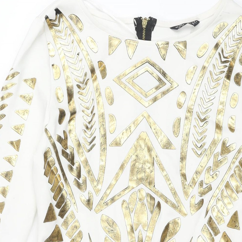 Womens White Polyester Bodycon Size 12 Round Neck Zip - Gold Geormetric Print