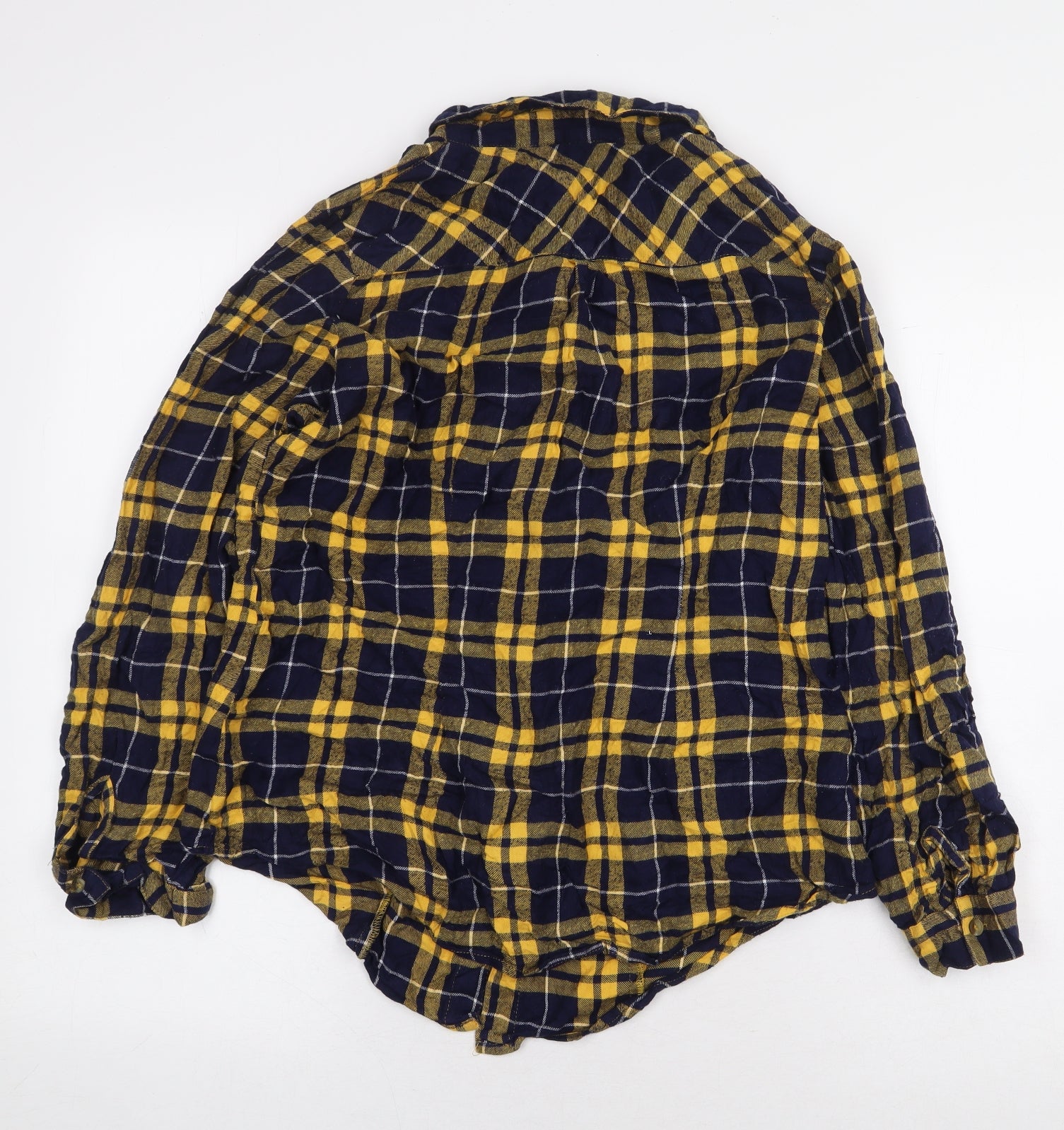 Womens Yellow Plaid 100% Cotton Basic Button-Up Size 14 Collared - Flannel Shirt