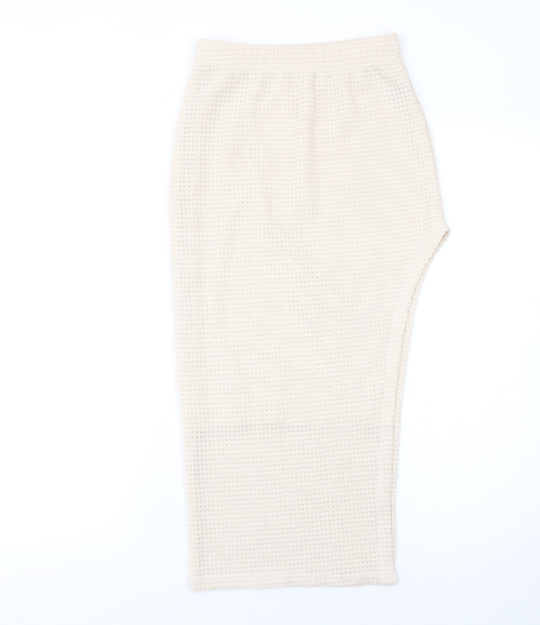 Elevate your everyday look with this stylish women’s beige midi knit pencil skirt from SHEIN. Crafted from soft and breathable polyester, this skirt offers a flattering silhouette that’s ideal for modern casual dressing. Designed with comfort in mind, it features a high-rise elastic waistband for an easy pull-on fit, creating a sleek shape that moves with you. The lightweight knit fabric adds texture and dimension, giving it a touch of sophistication while remaining effortless to wear. Perfectly neutral in tone, this skirt pairs beautifully with a wide range of tops — from fitted camisoles to oversized jumpers — making it suitable for a variety of occasions, whether you’re heading to a casual lunch, a relaxed office environment, or a weekend outing. Its midi length delivers a refined yet contemporary look, balancing elegance and comfort seamlessly. The skirt’s minimalist design and high-quality finish ensure versatility, whilst the stretch construction provides lasting ease of movement throughout the day. Ideal for warmer seasons such as spring and summer, it can also be styled with ankle boots and a knit jumper for a soft autumn ensemble. The absence of patterns maintains a clean, timeless aesthetic, allowing your accessories to take centre stage. With its refined shade of beige and simple silhouette, this skirt is a wardrobe essential for anyone who appreciates understated sophistication and practical style. Condition is excellent with minimal visible wear, reflecting excellent care and gentle use. Add this elegant SHEIN midi pencil skirt to your collection for a comfortable yet stylish addition that can be dressed up or down effortlessly. Perfect for the modern woman who values simplicity, quality, and stylish comfort in her wardrobe.