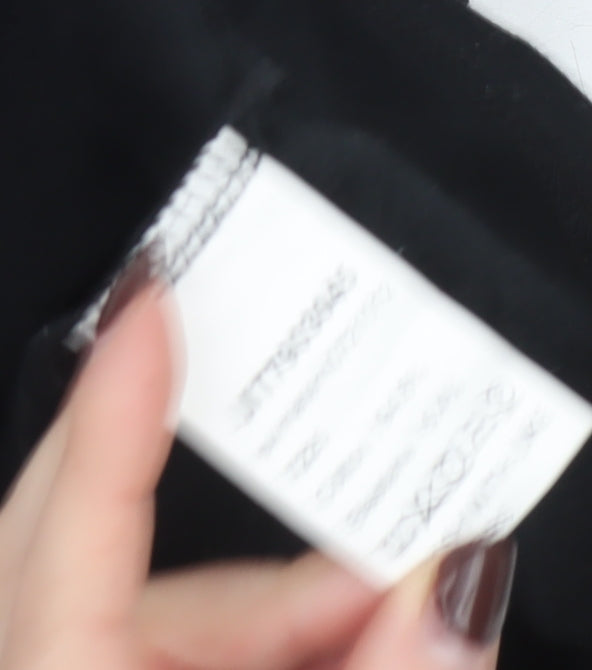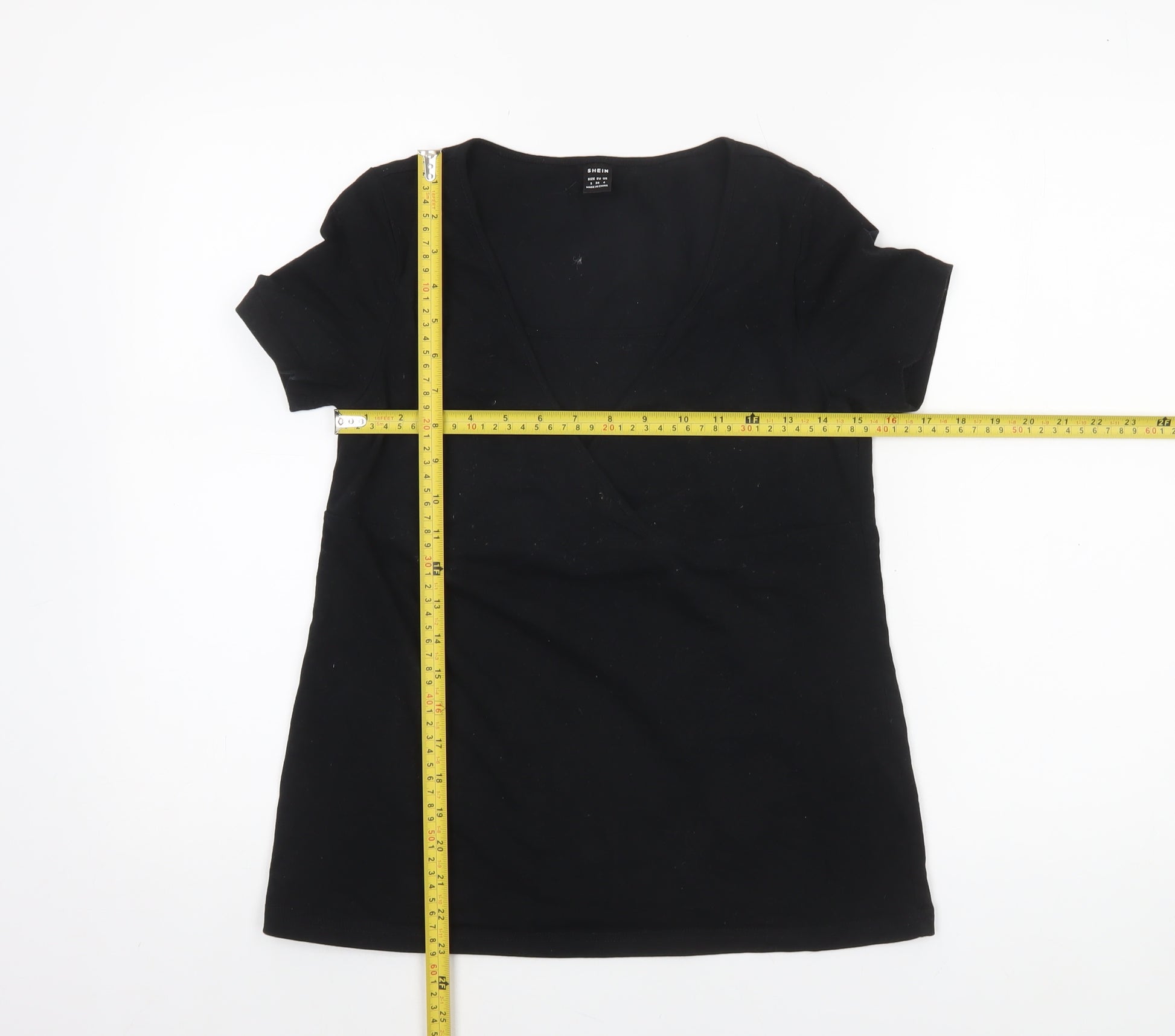 Add a touch of sleek minimalism to your wardrobe with this SHEIN women's black slim fit V-neck wrap T-shirt. Designed from a soft cotton blend with added elastane, this top offers a comfortable, lightweight feel with the right amount of stretch for a flattering fit. The classic short sleeves and wrap-style neckline create a feminine silhouette perfect for everyday wear. Crafted in smooth jersey fabric, it provides a breathable and easy-care option ideal for spring and summer styling. The pullover design ensures effortless dressing, while the slim fit shape makes it versatile for both casual and slightly dressier occasions. Pair it effortlessly with jeans for a relaxed weekend look, or tuck it into a high-waisted skirt for a chic, modern ensemble. The solid black tone makes it a timeless wardrobe essential that coordinates easily with a wide range of colours and textures. Though gently used, this T-shirt remains in very good condition with only minor lint marks visible. Conveniently machine washable, it’s practical for daily rotation and retains its shape wear after wear. Ideal for casual outings, layering under a blazer for workwear, or even pairing with tailored trousers for a minimalist style statement, this SHEIN T-shirt combines affordability, comfort, and effortless chic. Refresh your basics collection with this flattering and easy-to-style staple that seamlessly merges comfort and versatility—making it a must-have piece in any modern woman's wardrobe.