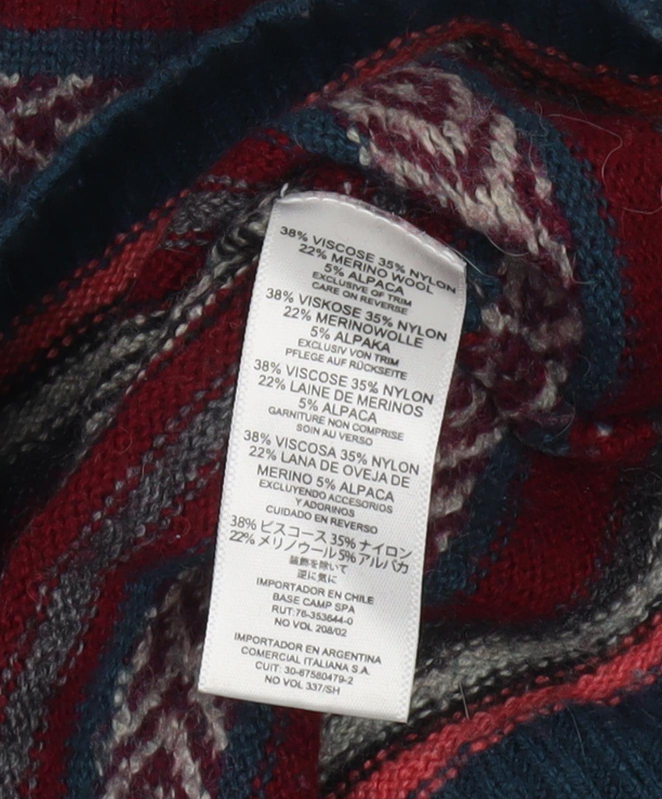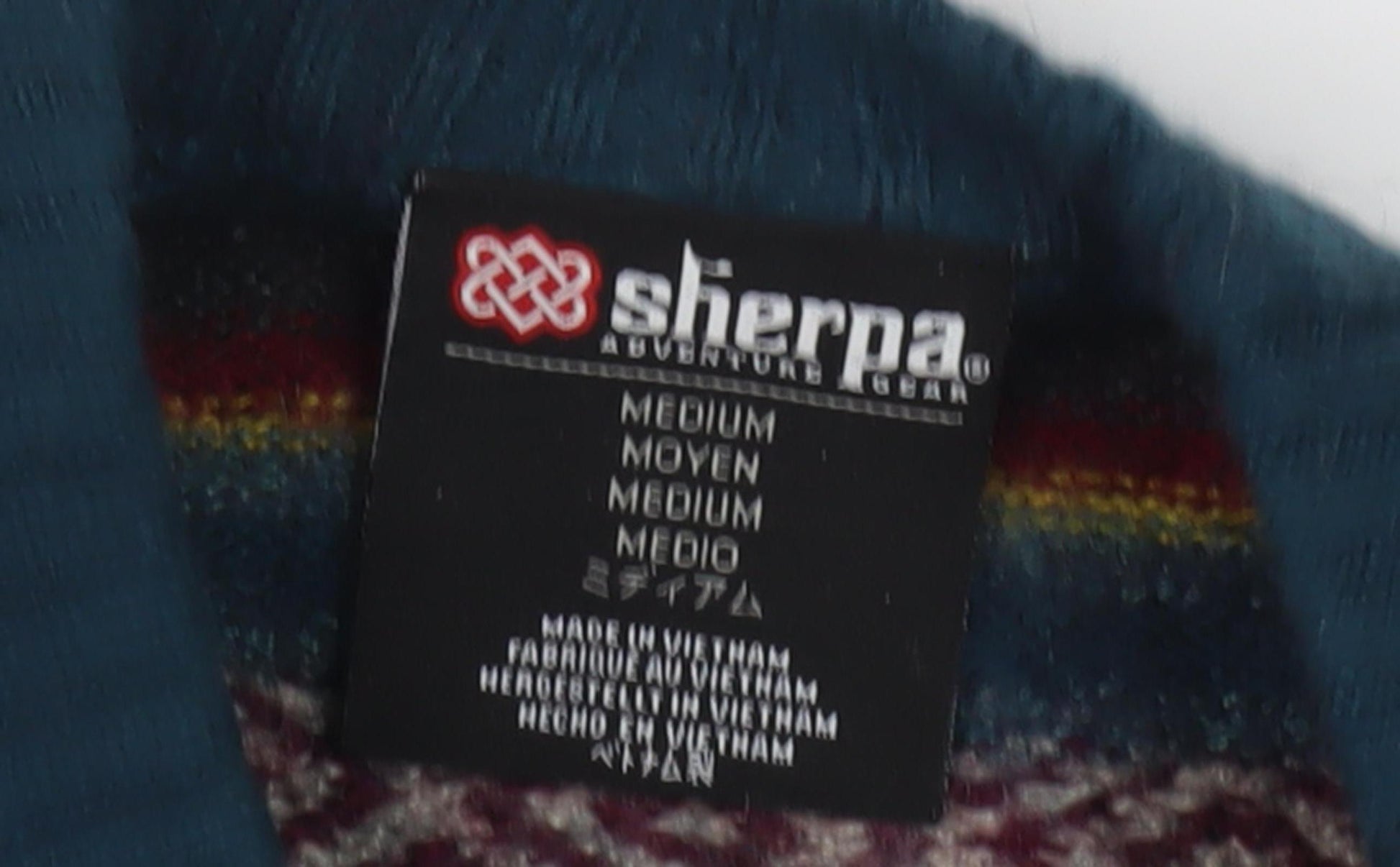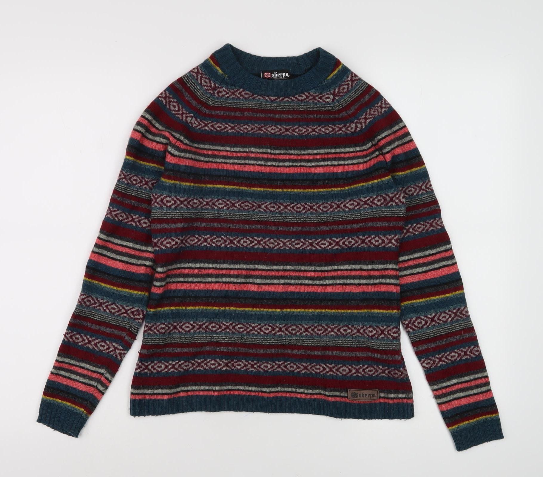 Elevate your winter wardrobe with this Sherpa Women's Pullover Jumper, crafted for both style and comfort. Featuring a vibrant multicoloured geometric pattern, this medium-sized jumper offers a playful yet sophisticated look. The crew neck design and long sleeves ensure warmth and a snug fit, making it ideal for autumn and winter wear. This knit jumper combines an exquisite blend of materials including viscose, nylon, merino wool, and alpaca, offering both softness and durability. Perfect for casual occasions, this jumper is machine washable for easy care. Despite being lightly worn, it remains in excellent condition without any noteworthy defects, offering great value for your purchase. Stay warm and stylish this season with this unique piece.