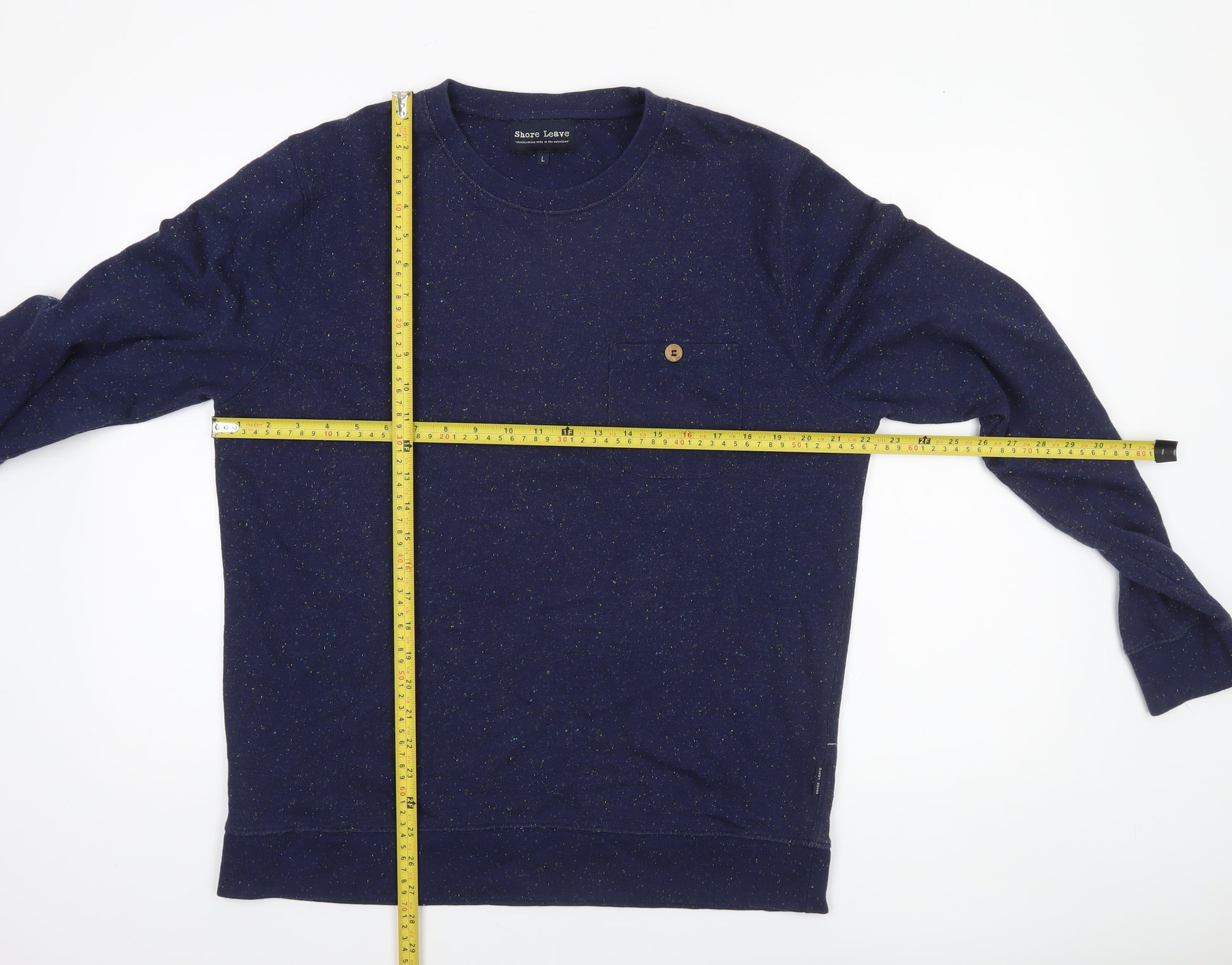 Upgrade your casual wardrobe with this stylish Shore Leave men’s sweatshirt in a rich blue shade. Designed for comfort and subtle style, it features a simple yet distinctive look with small speckled detailing and a single chest pocket finished with a contrasting button accent. The crew neckline and regular fit make it a versatile choice, suitable for a wide range of occasions, from relaxed weekends to casual evenings out. Crafted from a quality blend of 60% cotton and 40% polyester, this sweatshirt provides a soft feel with lightweight warmth that’s ideal for autumn, spring, and cooler winter days. The knit fabric ensures breathability and durability while maintaining shape wash after wash. Designed for all-season wear, it can be teamed effortlessly with jeans, chinos or layered under a jacket for a smart-casual ensemble. The Shore Leave brand is known for refined casualwear with thoughtful detailing, and this sweatshirt upholds that standard with its comfortable crew neckline, ribbed cuffs, and hem for a snug fit. The minimalist style is enhanced by its clean finish, punctuated by the playful pocket button and label tag detail, adding understated personality without overpowering your look. This long-sleeve pullover is in excellent pre-owned condition, showing light general wear with no visible flaws or damage. Perfect for everyday wear, it combines practicality with timeless style, making it an essential addition to any man’s wardrobe. Easy to care for and machine washable, it balances comfort, function, and fashion effortlessly.Whether worn as an everyday go-to layer or as part of a smart-casual outfit, this Shore Leave sweatshirt offers laid-back refinement and versatile wearability, making it a value choice for those who appreciate style that feels as good as it looks.