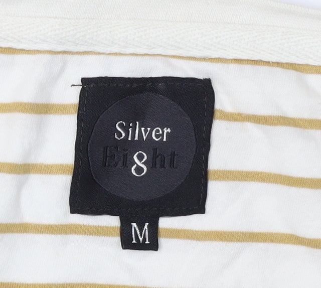 Introducing the Silver Eight Men's White Striped T-Shirt in size M, a versatile addition to any wardrobe. This classic piece features a universally appealing crew neck and short sleeves, making it the perfect choice for casual outings or relaxed occasions. Crafted from high-quality cotton, this T-shirt promises both comfort and durability, standing up to frequent use while retaining its fresh look.The subtle striped pattern adds a touch of sophistication to the traditional white tee, making it suitable for pairing with jeans, shorts, or under a jacket for a more polished appearance. Its regular fit ensures a comfortable wear that complements a variety of body types. Despite light wear, the T-shirt is in excellent condition, with no visible signs of damage or defects. Although it lacks original sales tags, the T-shirt's quality is evident in its fine craftsmanship and premium materials.Easy to care for, this T-shirt is machine washable, aligning with modern lifestyles that demand both style and practicality. Whether you are dressing for a summer outing or layering in cooler weather, this Silver Eight T-Shirt provides a stylish solution. Priced affordably, it is a smart choice for those looking to update their casual wear with a touch of elegance.