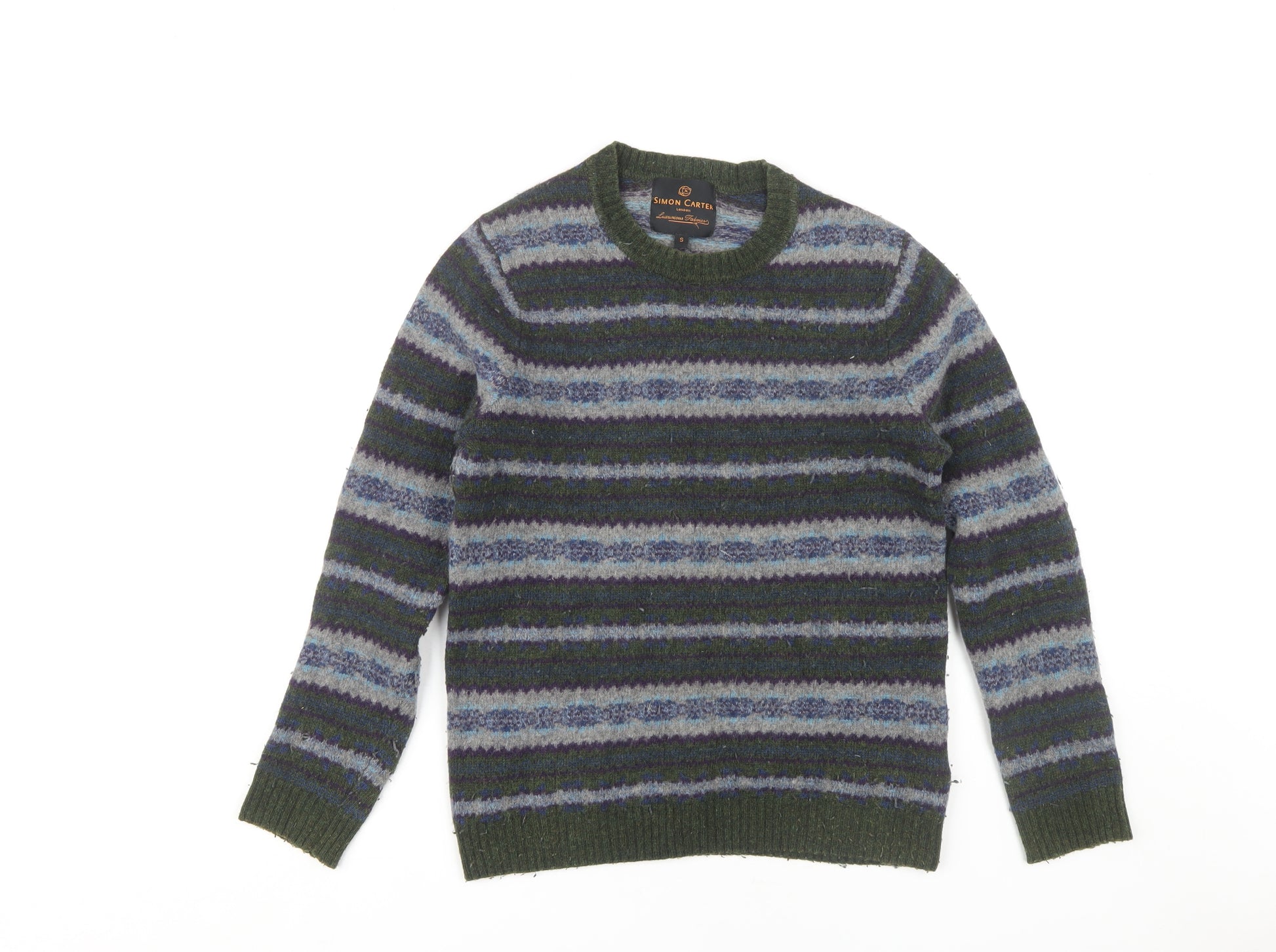 Upgrade your winter wardrobe with this Simon Carter jumper, ideal for those crisp autumn and winter days. Made from a luxurious wool blend comprising 80% wool and 20% nylon, this pullover offers both warmth and comfort. The striking multicoloured striped pattern adds a pop of style, perfect for any casual occasion. Designed for men, this regular fit jumper in size S is a versatile addition to your collection. Its crew neckline and long sleeves provide a classic silhouette, while the knit fabric ensures a cosy fit. Whether you're heading out for a casual day with friends or enjoying a relaxing afternoon at home, this jumper is your go-to choice. With no visible signs of wear, it's in excellent condition, ready to elevate your wardrobe with ease.