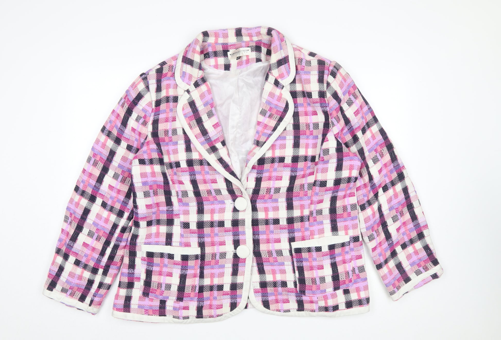 Add a touch of refined elegance to your wardrobe with this stunning Simon Jeffrey Women’s Blazer in a vibrant multicoloured check tweed design. Crafted from a quality blend of polyester and cotton, the jacket provides both comfort and durability, making it ideal for regular wear. The structured silhouette gives this piece a professional finish, balanced perfectly by the soft palette of pink, purple, black, and white tones. Styled with a flattering notch lapel and a two-button single-breasted front, this blazer offers an effortlessly polished look that transitions seamlessly from office days to social occasions. Designed in a Regular fit, the garment features a full polyester lining for a smooth interior and enhanced comfort while keeping its tailored shape. Twin front pockets add practicality and understated detail to the elegant tweed texture. This piece suits business, smart-casual, and workwear wardrobes perfectly, providing a versatile layer for spring and autumn seasons. Ideal to pair with tailored trousers or skirts, it can also elevate jeans for a chic weekend look. Crafted with Simon Jeffrey’s signature attention to detail, this blazer combines timeless appeal with everyday functionality. In excellent pre-owned condition, this jacket will become a lasting favourite in your collection. A superb choice for those who appreciate British-inspired design with a modern feminine twist. Refresh your wardrobe today with this uniquely stylish and quality piece from Simon Jeffrey Collection.
