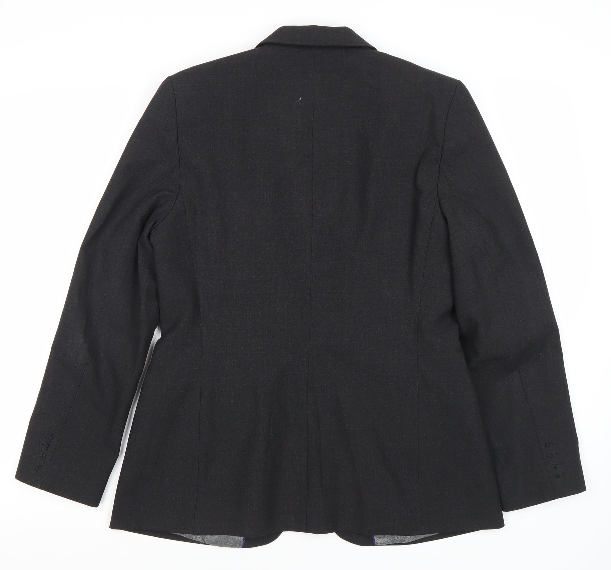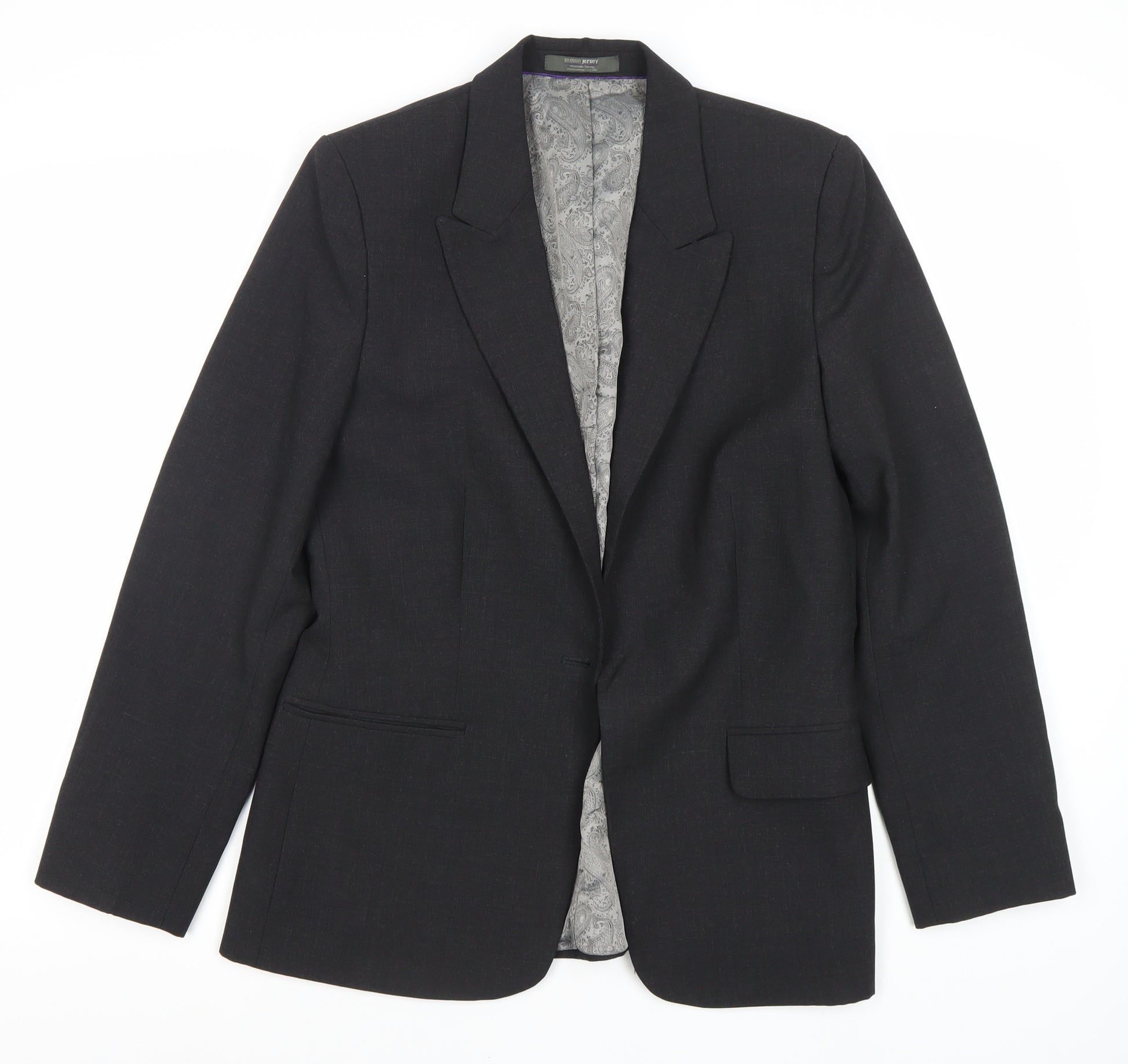 Discover timeless elegance with our Simon Jersey women's suit jacket in classic black. Perfect for professional settings, this jacket offers a sophisticated and versatile look suitable for any business occasion. Crafted from a durable blend of polyester, wool, and lycra, this single-breasted jacket is designed with a notch lapel and promises both style and comfort. The regular fit ensures a flattering silhouette, while its long sleeves and regular length add to its polished appearance.Made from 54% polyester, 44% wool, and 2% lycra, the fabric is woven to offer a refined finish. The full polyester lining enhances comfort, making it ideal for long workdays. This jacket boasts a two-button front and four-button sleeve design, embodying classic suit aesthetics.Machine washable for convenient care, this is an investment in quality and practicality. Although previously worn, it is in excellent condition, showing light wear with no visible damage. Experience versatile styling that complements your wardrobe, whether paired with skirts or trousers.Unlock a professional edge with this elegant piece, meeting the demands of modern workplace fashion without compromising on comfort or style.