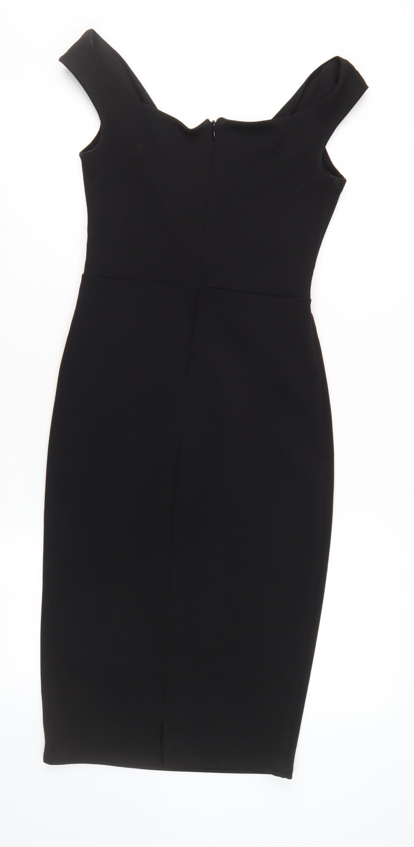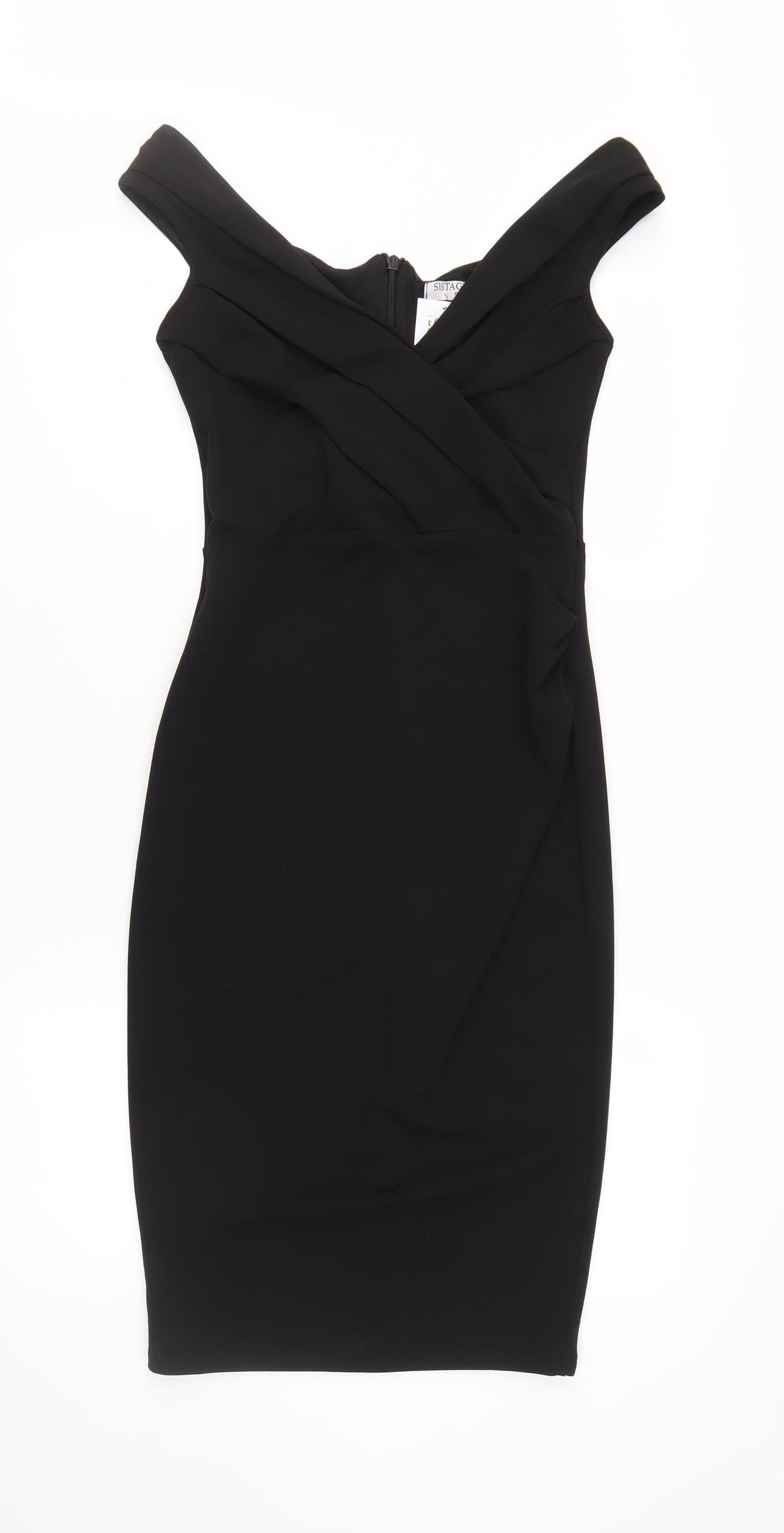 Step into timeless elegance with this stunning Sistaglam bodycon dress, designed to make you feel glamorous at any party or cocktail event. Crafted from a blend of lightweight polyester and stretchy elastane, it ensures both comfort and a flattering fit. The dress features a sophisticated off-the-shoulder neckline, adding a chic touch to its structured silhouette. Its classic black hue is versatile, allowing you to accessorize with your favourite statement pieces for any occasion. Boasting a zip closure at the back, it promises a seamless fit that accentuates your curves. The sleeveless design is perfect for layering with a stylish jacket or wearing as is during warmer months. Whether you're attending a wedding, cocktail party, or a night out, this knee-length bodycon dress will be your go-to piece for effortless style that never goes out of fashion.